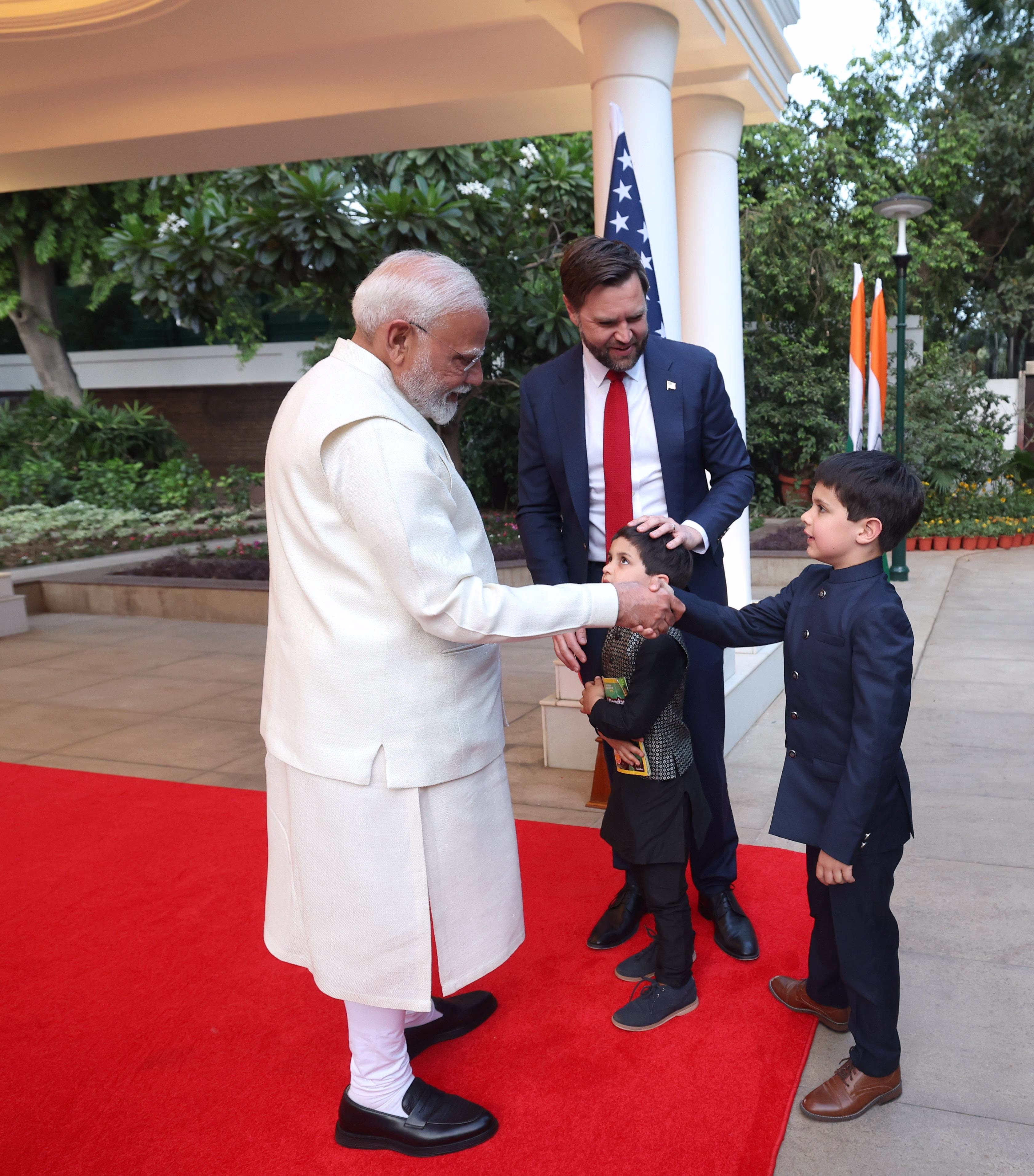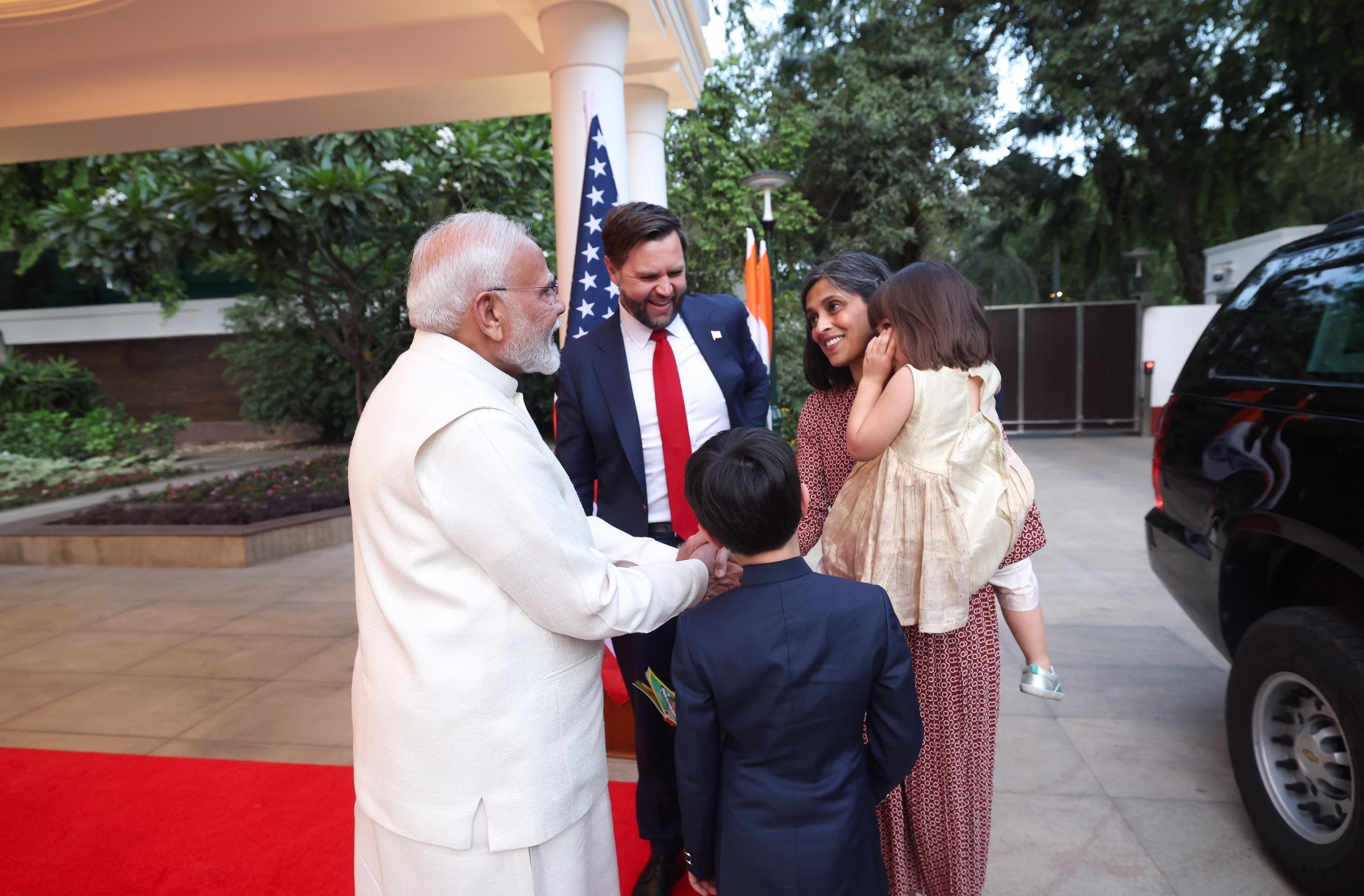 At the Prime Minister's residence on 7 Lok Kalyan Marg, a meeting took place between PM Narendra Modi and JD Vance. PM Modi extended a warm welcome to Vance and his family, rolling out the red carpet for them.