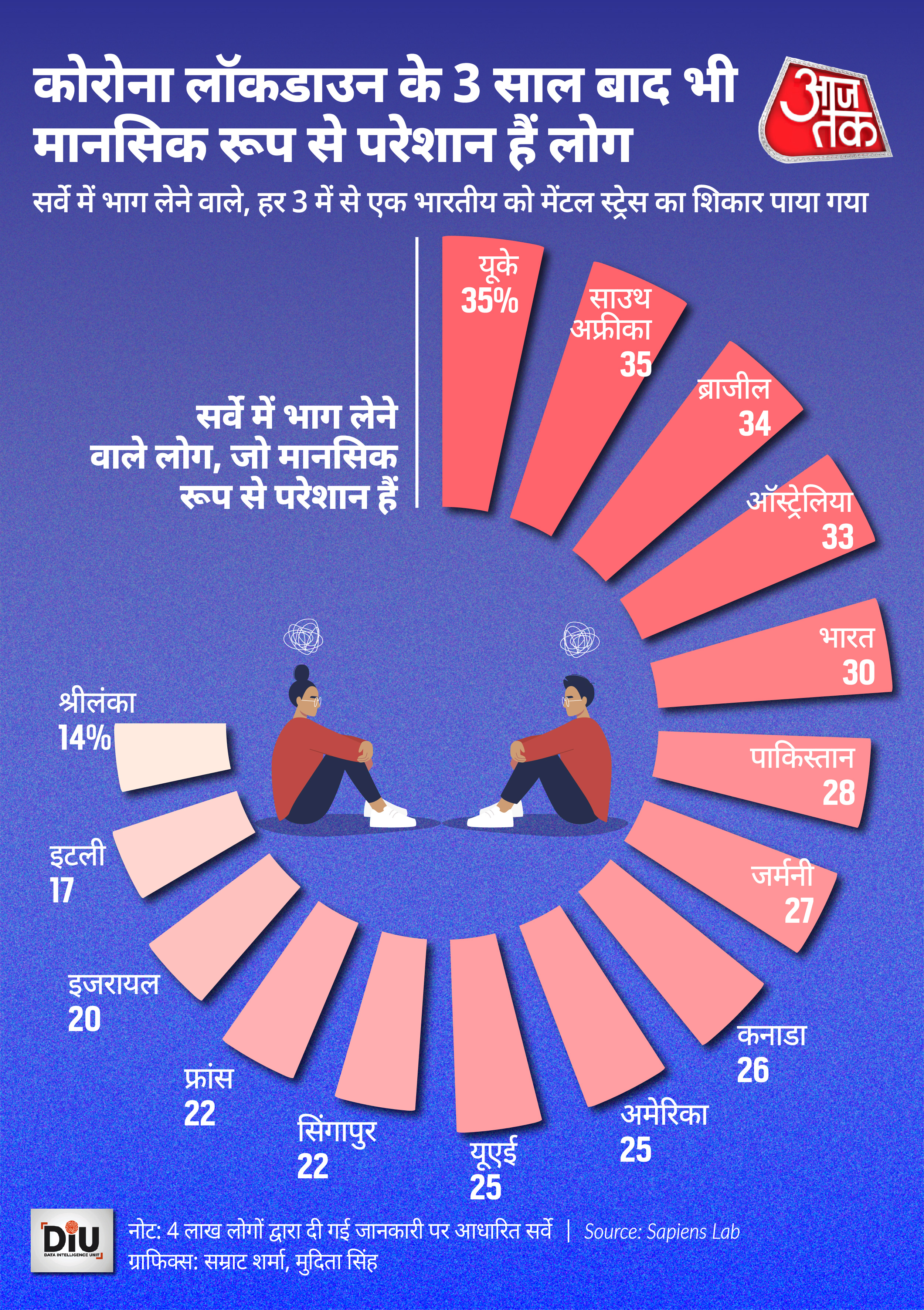 In a survey involving over 400,000 individuals across 71 countries (including 46,982 in India), it was found that 30.4% of Indians are mentally distressed and struggling with poor mental health, while the global figure stands at 27.1%. Countries like the UK, South Africa, Brazil, and Australia have higher rates of mental distress than India. In contrast, Canada, the USA, Singapore, France, Israel, Italy, and Sri Lanka report better mental health statistics.