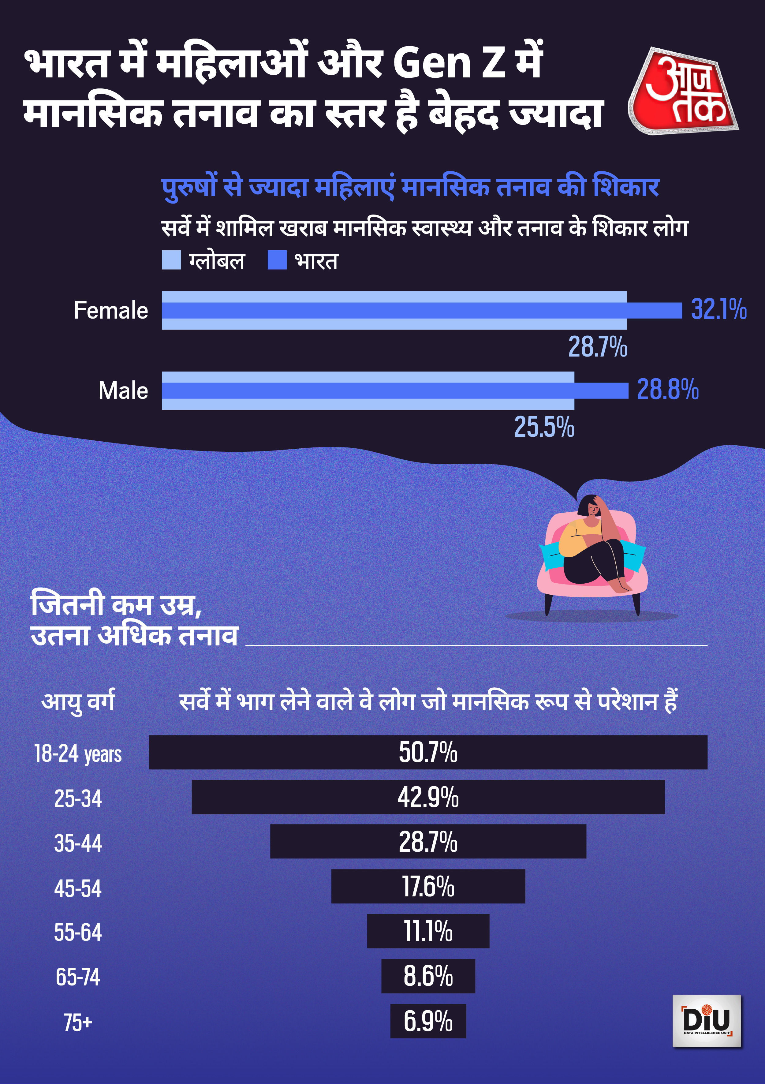 In India, more than half (50.7%) of people aged 18-24 are struggling with mental health issues. The survey shows a gender discrepancy in mental distress, with women being more affected than men. Globally, 28.7% of women are grappling with mental health problems, higher than the average for men.
