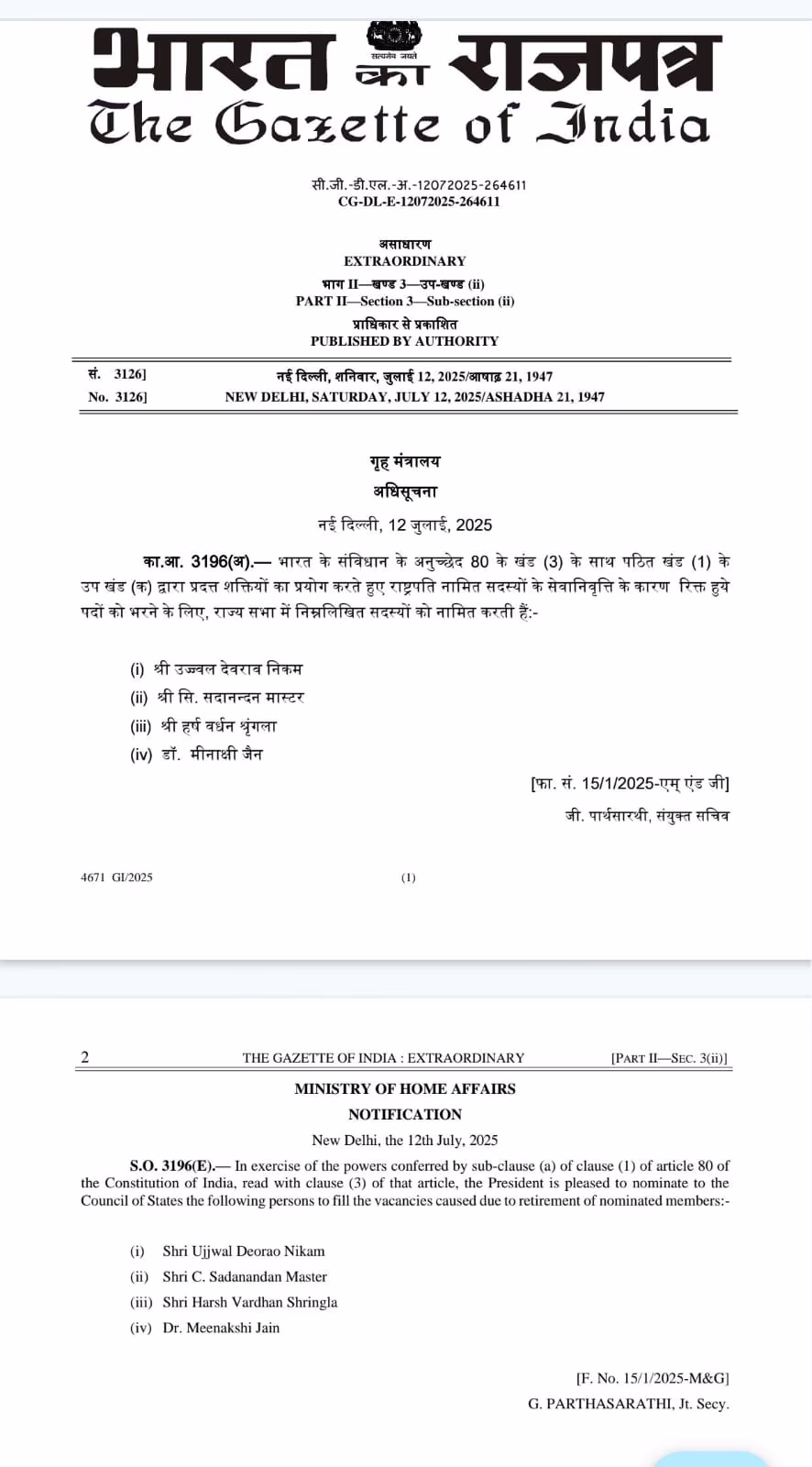 President Droupadi Murmu has nominated four new members to the Rajya Sabha. These include renowned lawyer Ujjwal Nikam, former Foreign Secretary Harsh Vardhan Shringla, historian Dr. Meenakshi Jain, and social activist from Kerala, C. Sadanandan Master.