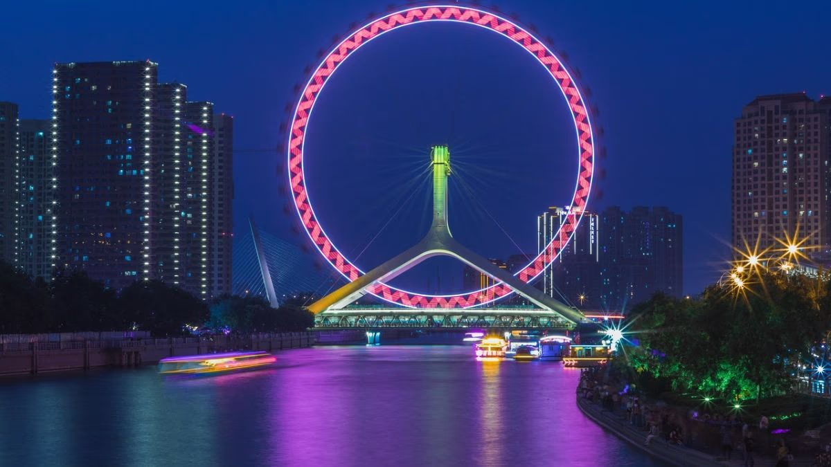Tianjin Eye, a massive Ferris wheel, marvelously set over the Hai River, stands at 120 meters high and completes a full circle in about 30 minutes. The panoramic views of skyscrapers and riverbanks are breathtaking, especially during the evening when the lights reflect beautifully on the water, making it a dreamlike attraction for tourists.