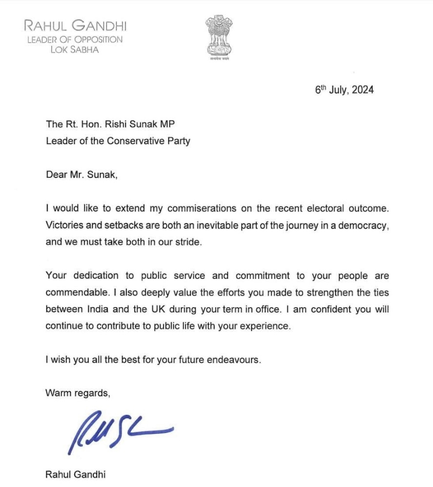 In a letter shared by the official Congress account, Rahul Gandhi wrote, "Dear Rishi Sunak, I would like to express my condolences at the recent election results. In a democracy, both victory and defeat are integral parts of the journey, and we must accept them with grace. Your dedication to public service and commitment to your people is commendable."