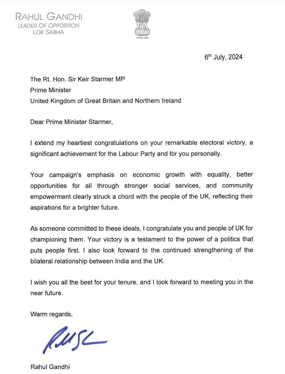 Writing to the newly elected Prime Minister Starmer, Gandhi said, "Dear Prime Minister Starmer, I extend my heartiest congratulations on your remarkable electoral victory, which signifies an important achievement for the Labour Party and for you personally. Your campaign's emphasis on equality with economic growth, enhancing opportunities for all through strong social services, and community empowerment has clearly resonated with the hearts of the people in the UK, reflecting their aspirations for a bright future."