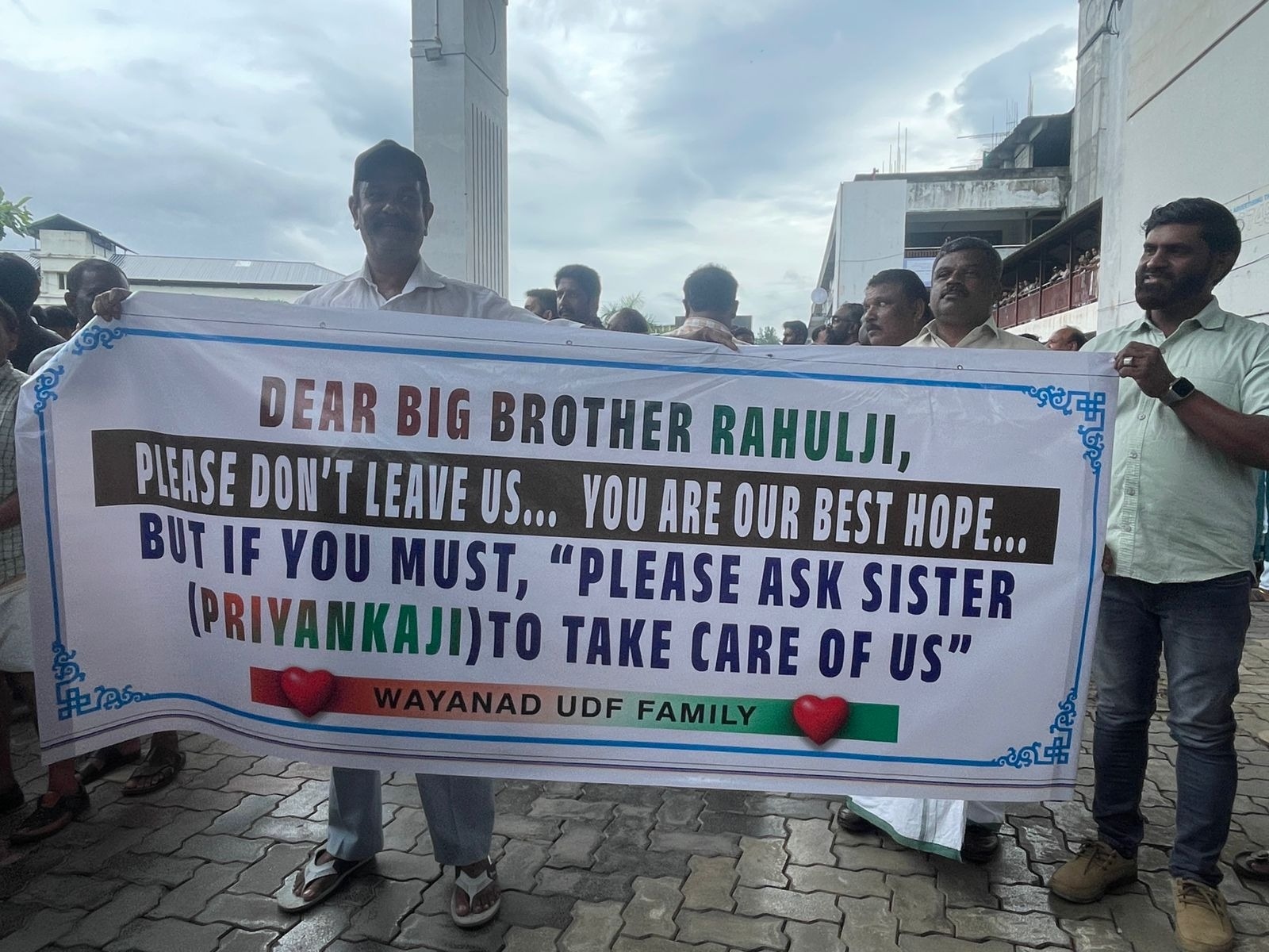 Amidst speculations of Gandhi's seat vacancy, Congress workers in Wayanad displayed posters expressing solidarity and appealing, "Please don't leave us, Rahulji, but if you must, ask your sister Priyanka Gandhi to care for us."