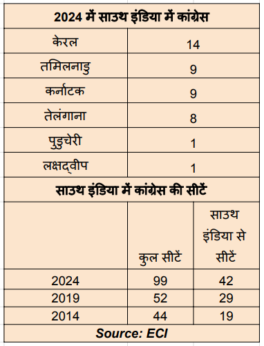 In the 2019 elections, Congress had also secured the majority of their seats from South India. Out of the 52 seats they won, 29 were from the South.