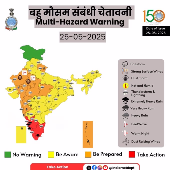 Heavy rainfall is forecasted for Uttarakhand on May 25 and again from May 28 to 30, while Himachal will experience strong rain on May 30-31. Hailstorms warnings are issued for May 27-28.