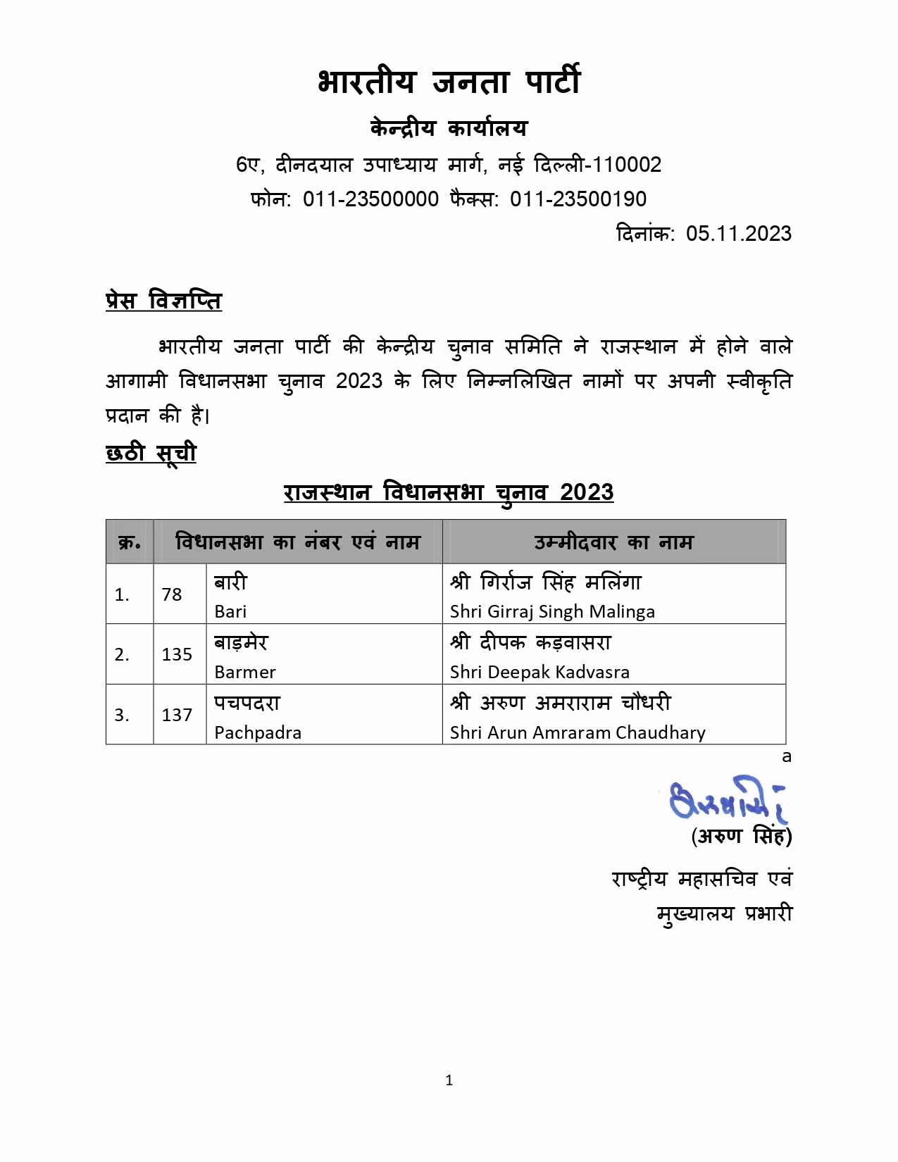 The Bharatiya Janata Party (BJP) has unveiled its sixth and final candidate list for the upcoming Rajasthan Assembly elections. This list finalizes tickets for three candidates. Notably, BJP has fielded Deepak Kadwasara from Barmer, Girraj Singh Malinga from Bari, and Arun Mara Ram Chaudhary from Pachpadra. This list draws attention as it includes Girraj Singh Malinga, a former Congress legislator now in BJP, who has secured a ticket from Bari.