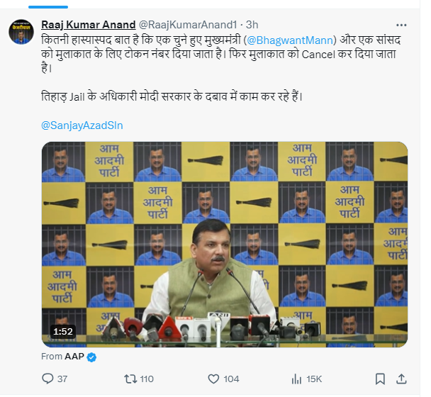 These were Anand’s words after stepping down, but mere two hours before, he was actively supporting AAP and targeting the Modi government. He shared a video of AAP leader Sanjay Singh commenting on the ridiculousness of an elected Chief Minister (@BhagwantMann) and a Member of Parliament being given a token number for a meeting, only for it to be canceled later. Anand accused Tihar Jail officials of working under pressure from the Modi administration.