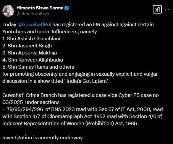 The Assam Police have filed a case against Ranveer Allahbadia. The state's Chief Minister, Himanta Biswa Sarma, tweeted the action. FIRs have also been lodged against Ashish Chanchlani, Jaspreet Singh, Apoorva Makija, and Samay Raina, among others.