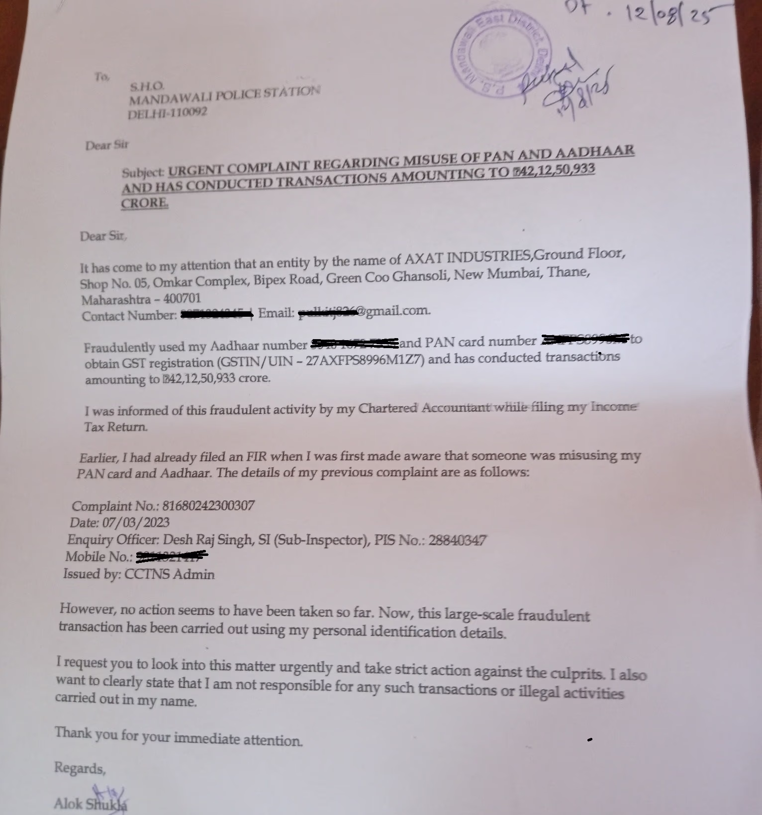 Resident of Delhi, Alok Shukla shared the ordeal on the social media platform Facebook. He recounted the shock encountered by his Chartered Accountant during the filing of the Income Tax Return. A company named AXAT Industries had registered a GST number under his PAN, enabling transactions over 420 million rupees.