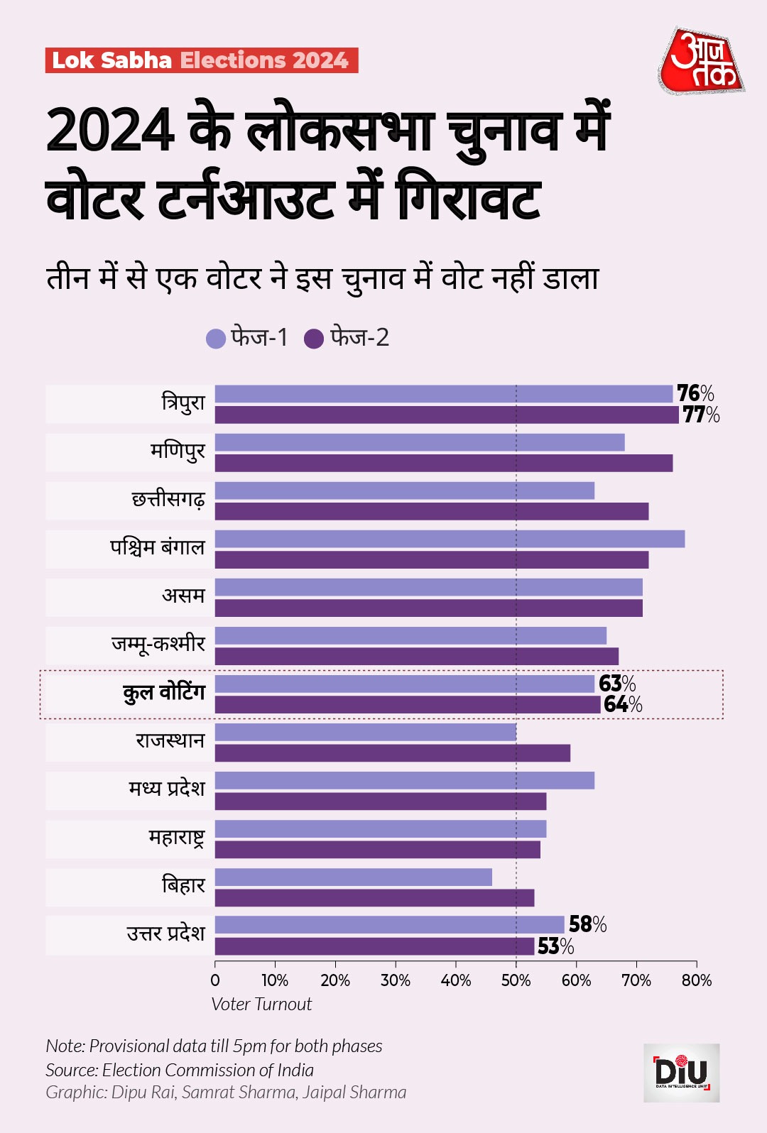 The second phase saw the highest turnouts in Assam with 70.68%, Manipur with 77.18%, and Tripura with 77.97%. Contrastingly, Maharashtra and Uttar Pradesh trailed with 53.71% and 54.85% respectively.