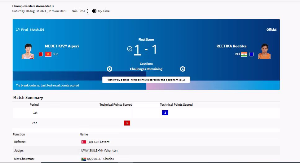 Indian wrestler Reetika Hooda faced a tough loss in the women's 76 kg freestyle wrestling quarter-final. Played on July 10, Reetika was defeated by top-seeded and two-time World Championship medalist Apury Kaizi from Kyrgyzstan. The match concluded with a 1-1 draw, but since the last point was scored by Apury Kaizi, she emerged victorious. Reetika now has a chance to win a bronze medal through the repechage round; however, she needs Apury Kaizi to reach the event's final.