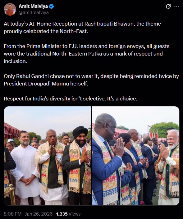 Opposition leader Rahul Gandhi is embroiled in controversy for not wearing the traditional northeastern dupatta at the Republic Day 'At Home Reception' hosted at the President's House. The BJP criticized his actions, calling them an insult to the northeastern people and their cultural symbols. According to BJP's IT cell head Amit Malviya, Gandhi ignored President Droupadi Murmu's reminders to wear the dupatta, sharing this on social media platform 'X'.
