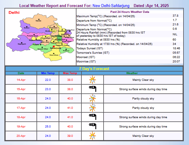 Focusing on Delhi's weather, today, being Tuesday, strong surface winds are expected throughout the day. The minimum temperature may settle at around 23°C while the maximum could reach up to 38°C. Tomorrow (April 16th), the temperature could touch the 40°C mark again, and a further rise in temperature is anticipated over the coming days.