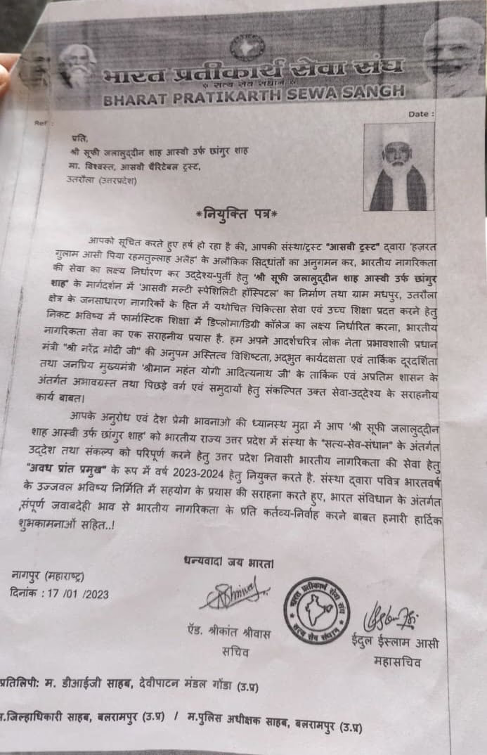 Eidul Islam had attached a photo of Prime Minister Narendra Modi onto the organization's fake letterhead, with claims that the headquarters were in Nagpur. It was alleged to be connected with the Rashtriya Swayamsevak Sangh (RSS). The investigation revealed that Chhangur was duly appointed as the Secretary for the Awadh region by Eidul Islam.