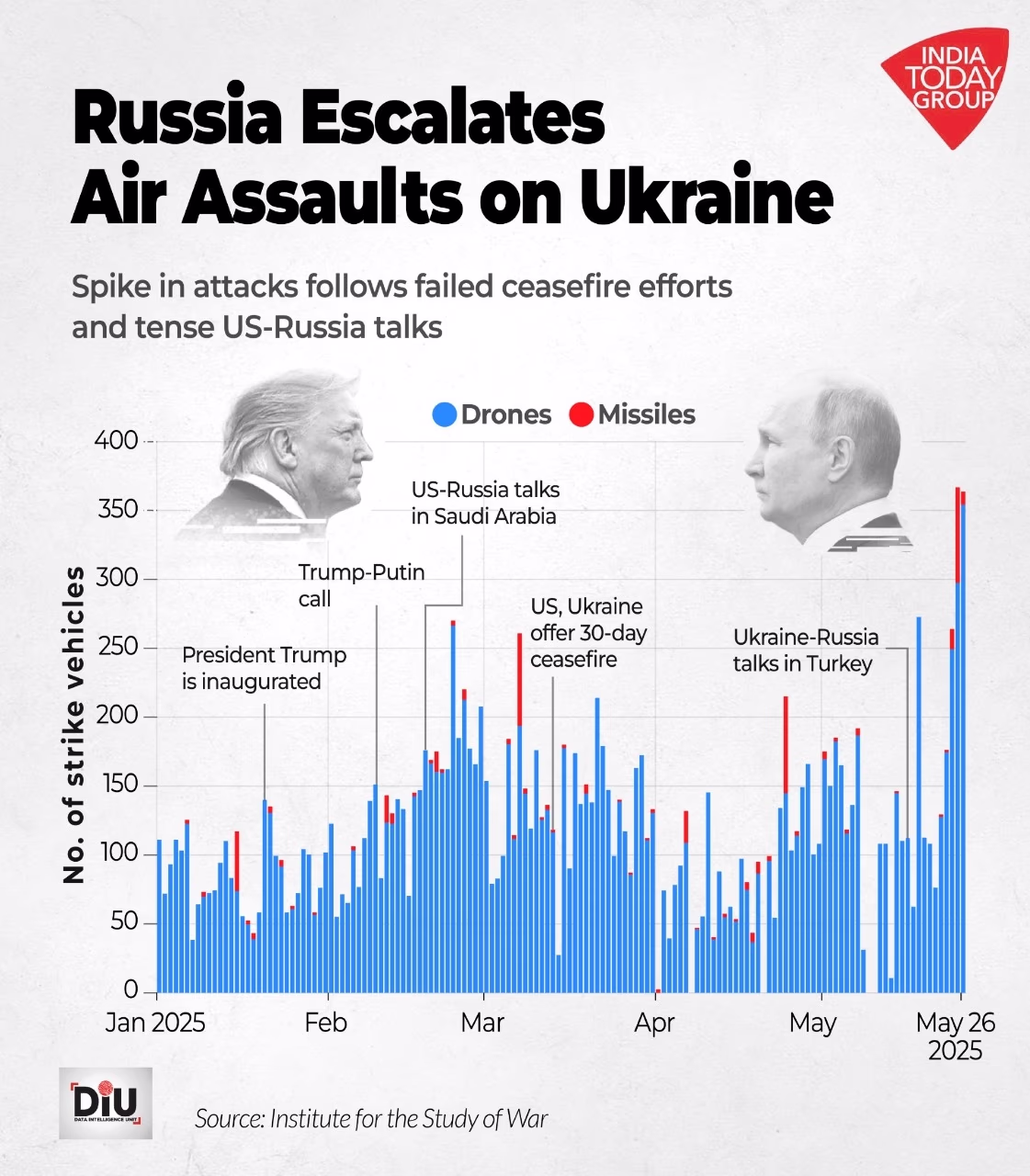 Russia conducted its largest drone and missile attack on Ukraine to date, which took place on the night of May 25th-26th. Over three nights from May 25th, record-breaking attacks were launched. Initially, on May 25th, Russia struck 13 Ukrainian areas with 298 drones and 69 missiles, resulting in 14 fatalities and 70 injuries. On May 26th, the assault continued with 355 drones and 9 missiles. Ukrainian President Volodymyr Zelensky announced on May 26th that over 900 drones had been launched by Russia over three days.