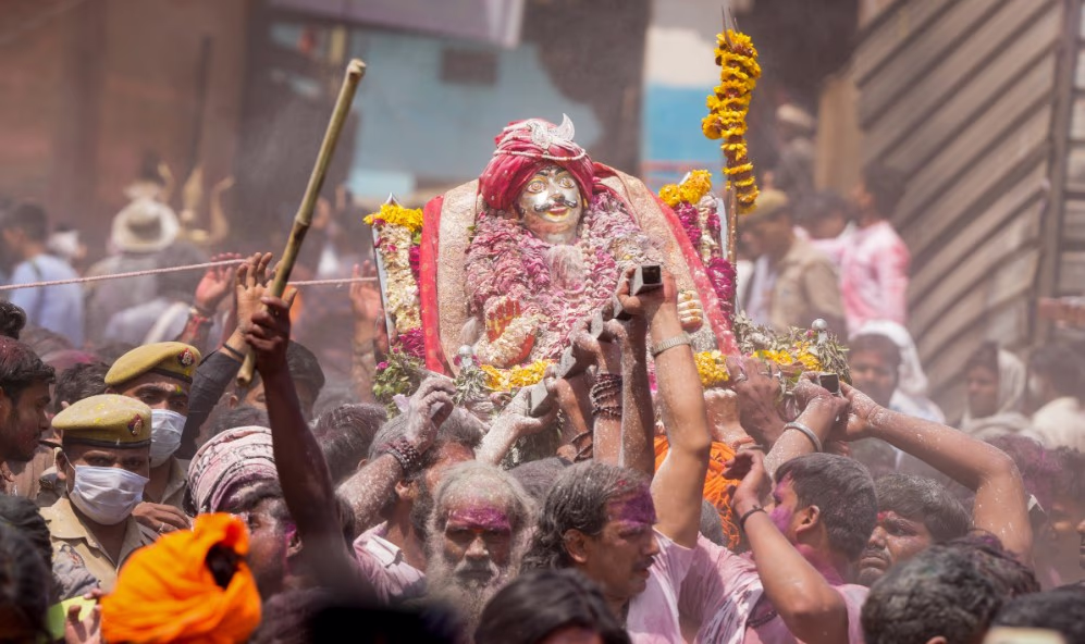 In the world, Holi is epitomized by Radha and Krishna, intertwined in color and form—where Radha embodies the hues themselves, and Shyam is the colored visage. Where mountain stones echo with shade, and droplets on the Yamuna's flow and dew mirrors are Radha's essence.