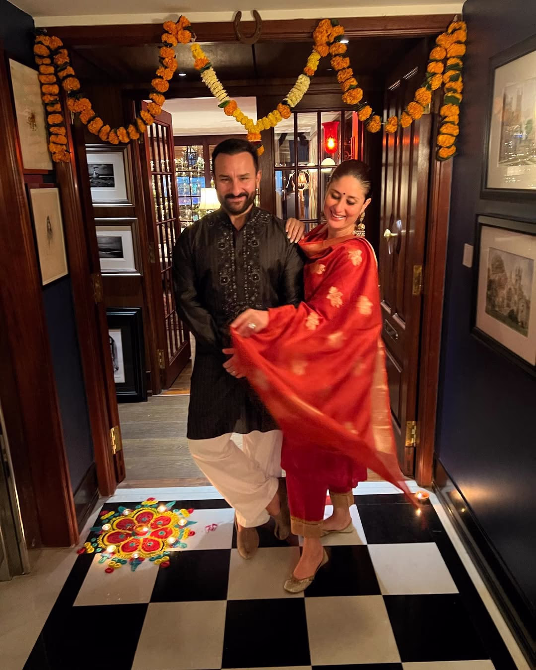 The central courtyard of Saif's home is where the family celebrates numerous festivals and birthdays. The charming checkered marble floor is a standout feature in many photos.