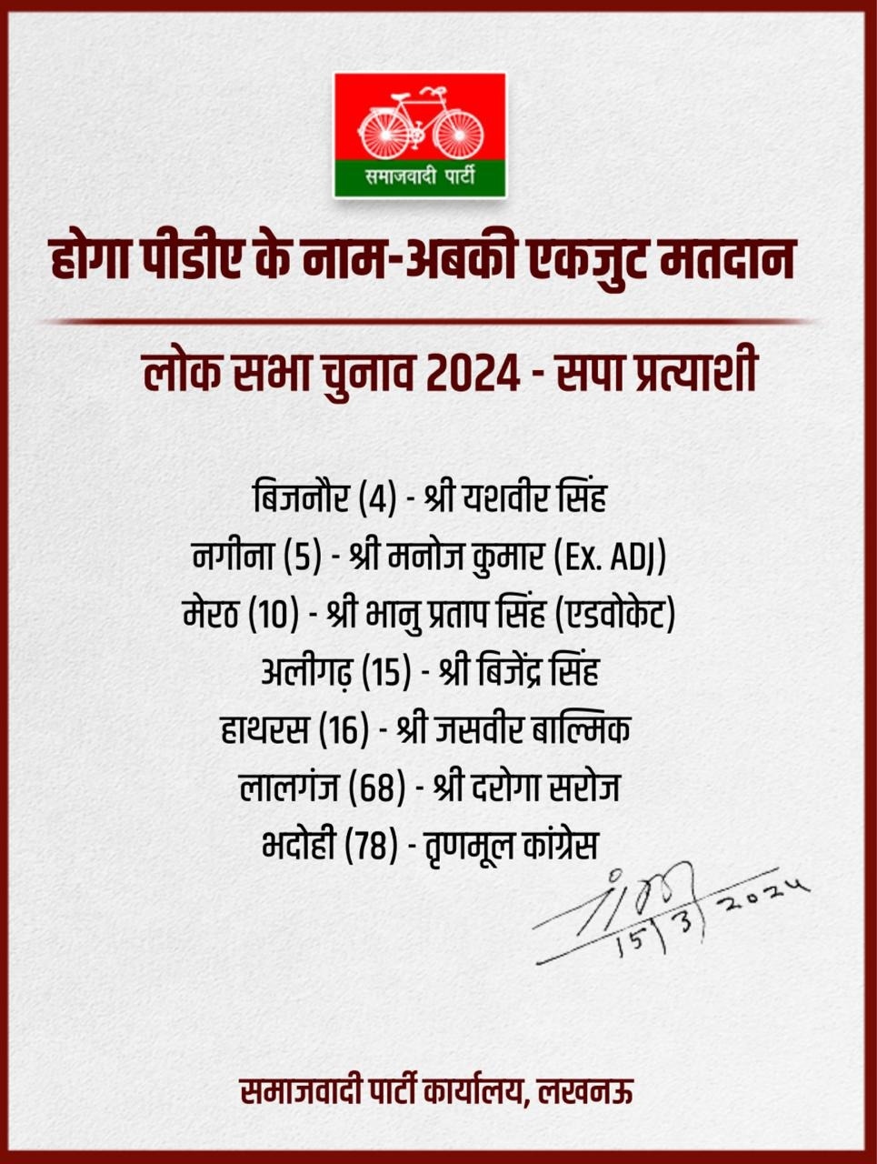 The Samajwadi Party has officially rolled out its fourth list of candidates for the approaching Lok Sabha elections. The announcement includes seven names from the party. Notables like Yashvir Singh from Bijnor, Manoj Kumar from Nagina, and Bhanu Pratap Singh from Meerut have been included.