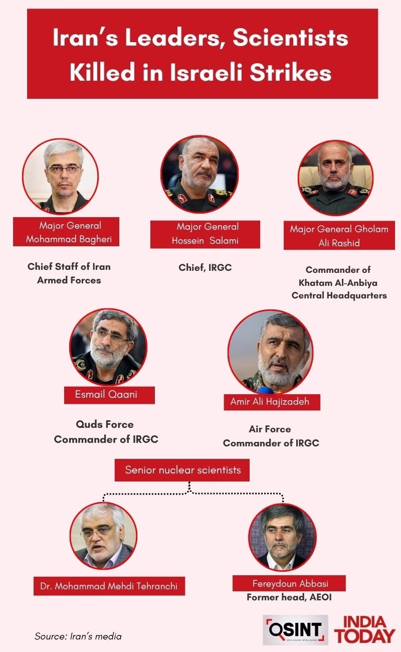 Additionally, Israel's secret service, Mossad, conducted a covert sabotage operation inside Iran using assembled drones. Meanwhile, Israeli attacks resulted in the deaths of at least seven top Iranian military officials, including the head of the powerful Islamic Revolutionary Guard Corps (IRGC), Army Chief, the leader of the Khatam al-Anbiya Headquarters, and the commander of the Quds Force. These commanders were killed in precise attacks while they were asleep.