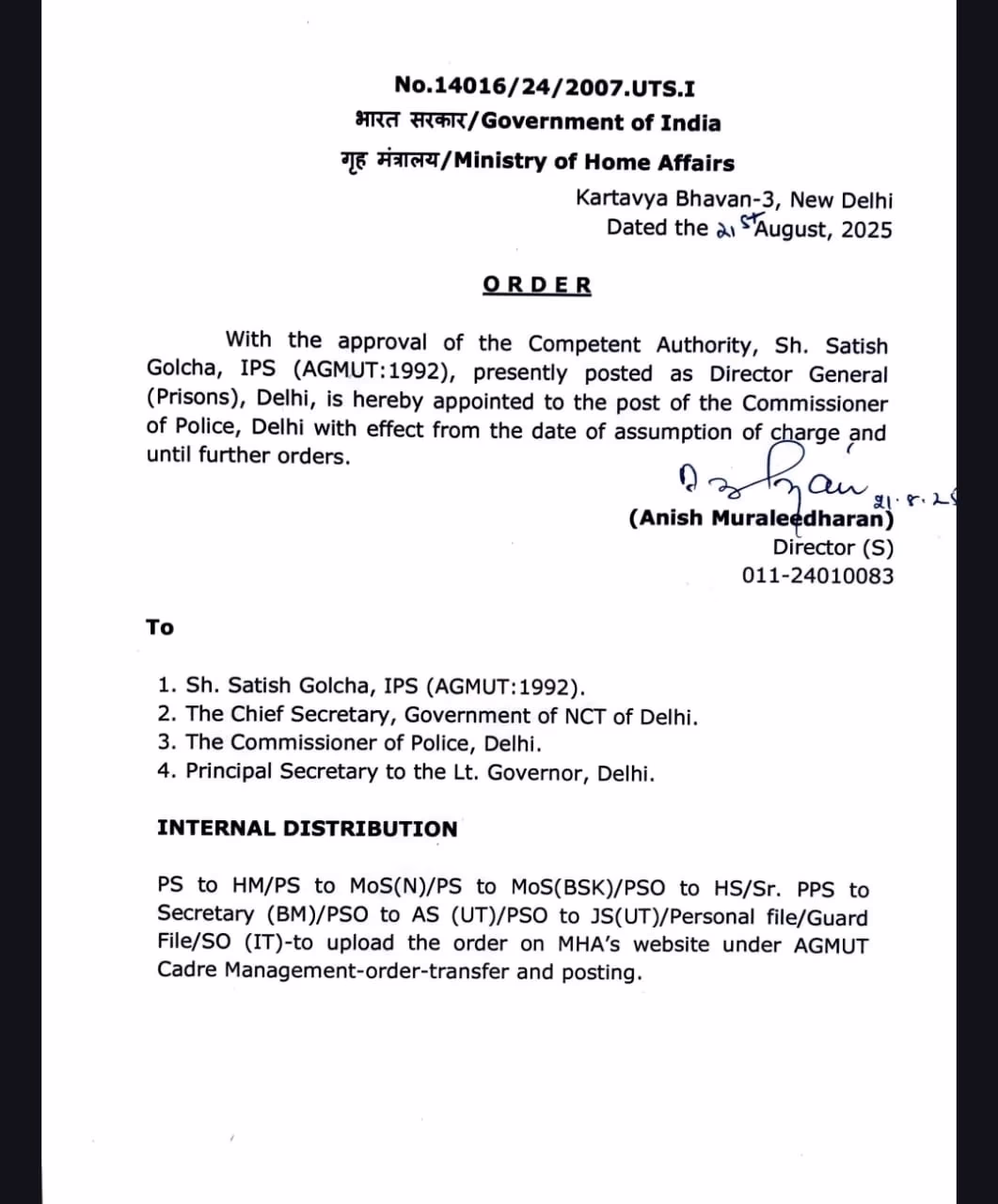 Delhi's police force has a new leader. Satish Golcha has been appointed as the new Police Commissioner of Delhi. He takes over from Shashi Bhushan Kumar Singh (SBK Singh), who was acting as interim police commissioner. According to the order by the Ministry of Home Affairs, Satish Golcha, a senior IPS officer, will now serve as Delhi's Police Commissioner. He previously held the position of DG (Prisons) in Delhi. His appointment will take effect immediately upon assuming charge and will continue until further orders. Satish Golcha belongs to the 1992 batch of IPS officers.