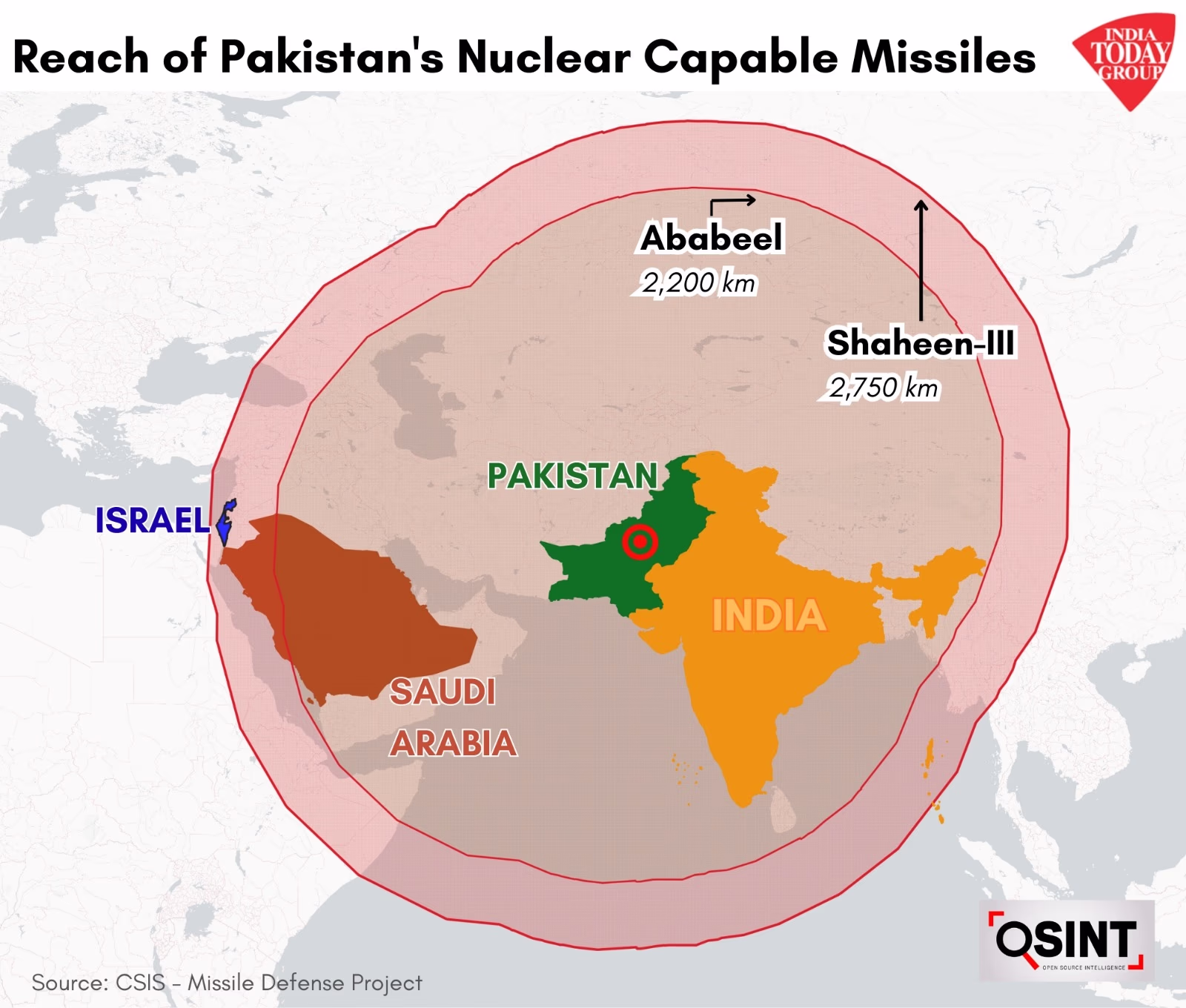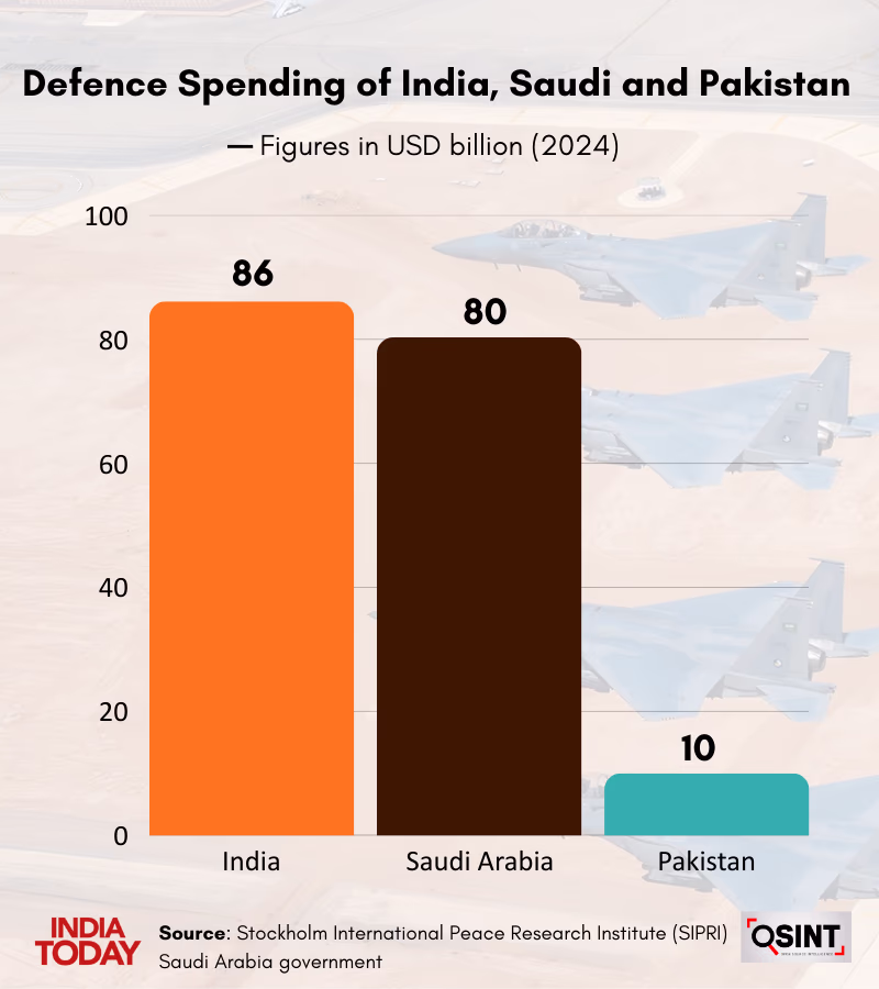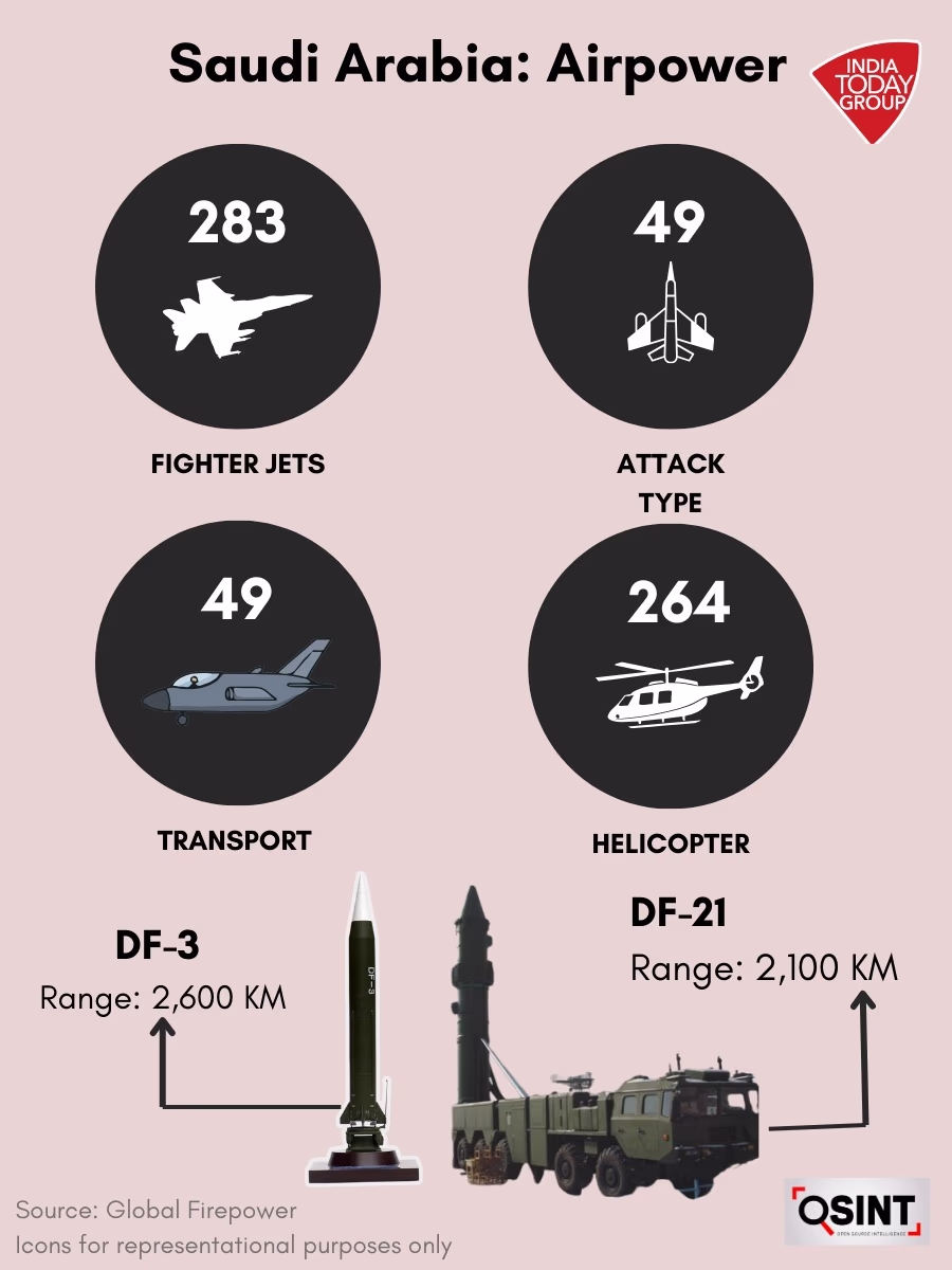Saudi Arabia sources most of its arms from the U.S., China, and Europe. It possesses around 280 fighter jets, mainly American-made fourth-generation F-15S and F-15C, alongside Eurofighter Typhoons and Panavia Tornado jets from Germany. Additionally, it employs U.S.-manufactured missile defense systems like THAAD and Patriot. While Saudi Arabia's missile arsenal remains somewhat opaque, it holds Chinese intermediate-range missiles, DF-3 and DF-21, designed for traditional rather than nuclear attacks. Hence, Saudi may require nuclear-capable armaments from Pakistan alongside conventional missiles if necessary.