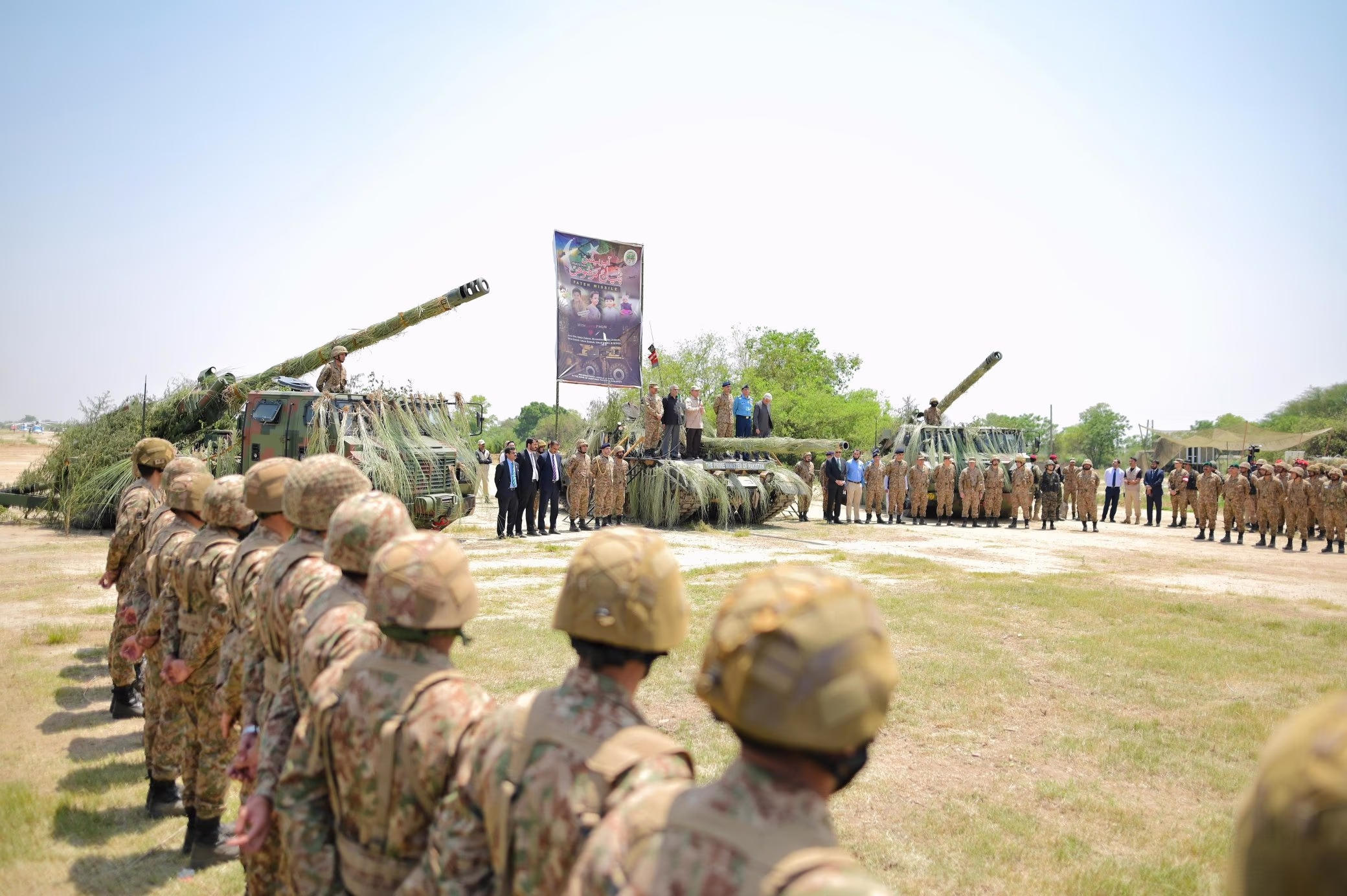 Accompanied by Army Chief Aseem Munir, Pakistan's Air Chief, and Defense Minister Khawaja Asif, along with other military officials, Sharif's proceedings often seemed theatrical. From atop the tank, he patted the backs of Aseem Munir and Air Marshal Babar as officers saluted him from below.