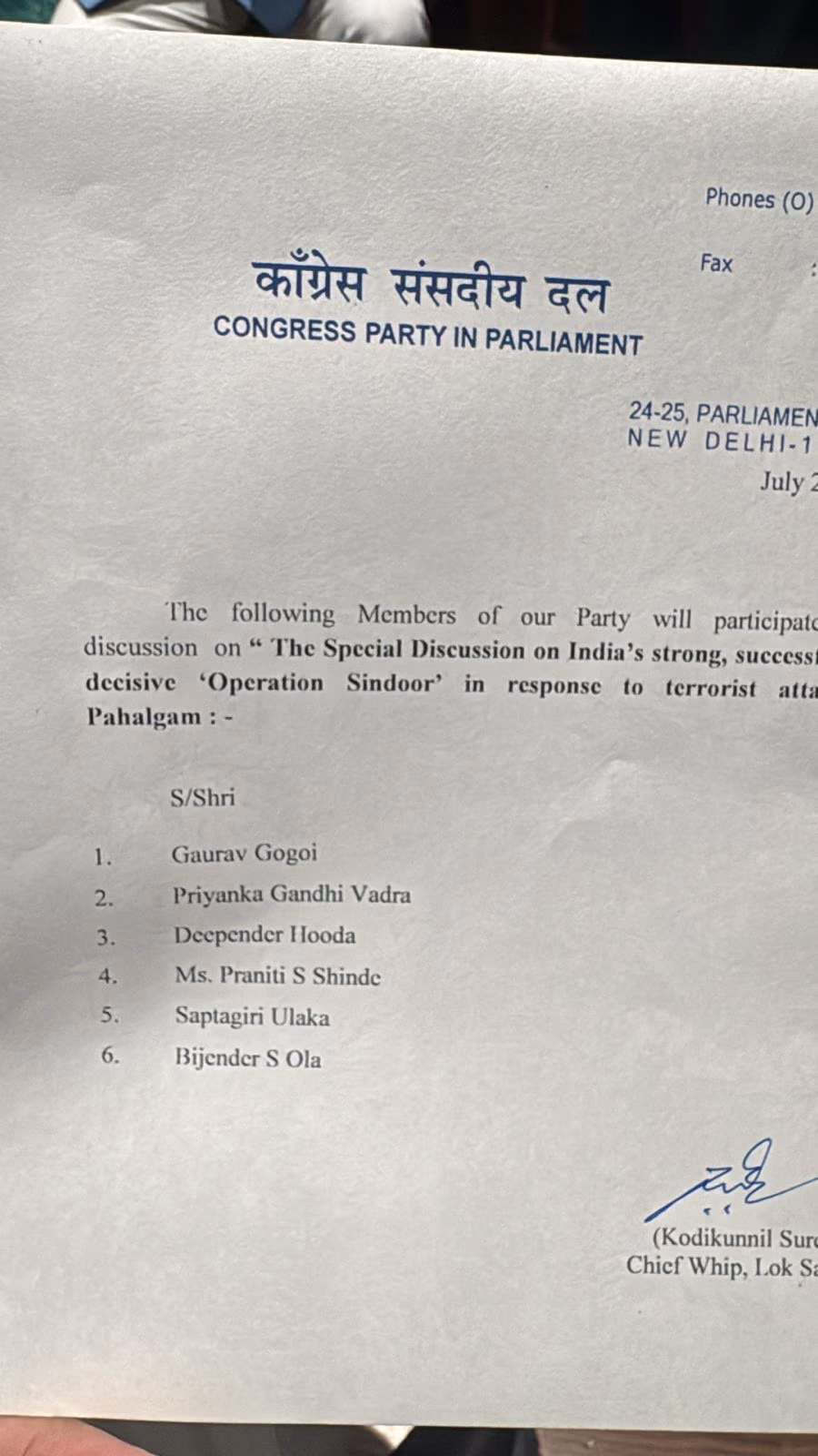 On a special discussion regarding India's Operation Sindoor in response to the Pahalgam terror attack, Congress representatives Gaurav Gogoi, Priyanka Gandhi Vadra, Deepender Hooda, Praniti S. Shinde, Saptagiri Ulaka, and Bijendra S. Ola will participate.