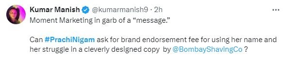 Another commented, "Marketing under the guise of a 'message.' Can Prachi Nigam demand brand endorsement fees for cunningly using her name and struggle in the cleverly crafted copy by Bombay Shaving?"