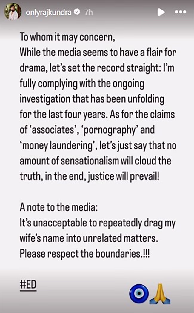 Raj Kundra took to his Instagram handle to share a story, stating - The media excels at dramatization; let’s bring the truth to light. I have been fully cooperating with the ongoing investigation for the past four years. As far as allegations concerning 'associates', 'pornography', and 'money laundering' are concerned, all we will say is that sensationalism cannot hide the truth. In the end, justice will triumph.