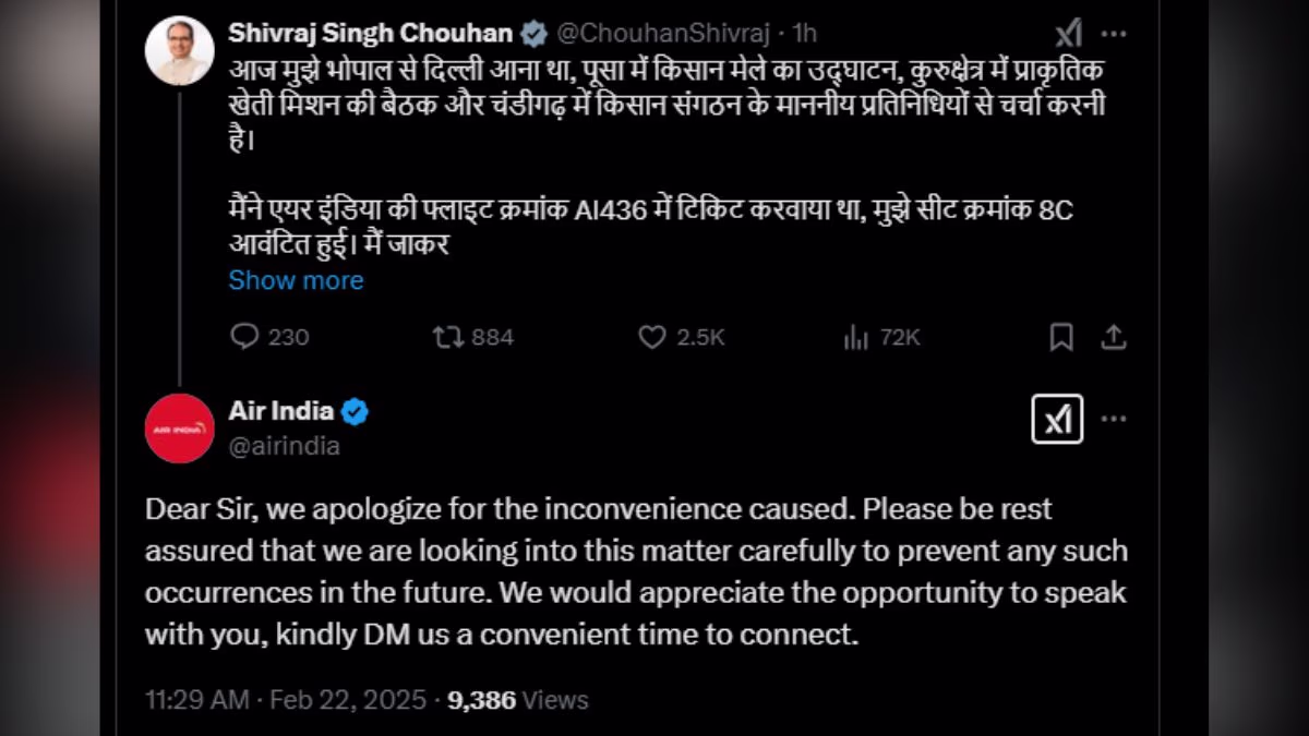 In response to Shivraj Singh Chouhan's complaint, Air India replied via their official X (Twitter) handle, stating, "Dear Sir, we apologize for the inconvenience caused. We are looking into this matter and would like to speak with you. Please DM us at your convenience."