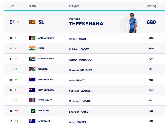 Sri Lankan spinner Mahesh Theekshana continues to govern the top spot in the ODI bowler rankings, with Afghanistan's spinner Rashid Khan keeping the pressure as his closest rival at number two.