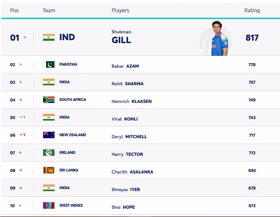 Gill has stretched his lead at the top by 47 rating points, a commanding advantage, while Pakistan's former captain Babar Azam clings to second place despite an underwhelming display so far.