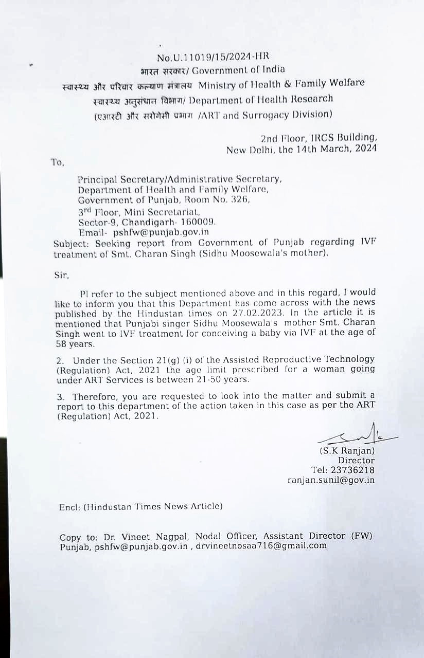 On March 14th, the Ministry of Home Affairs sent a letter to the Punjab government referencing a media report concerning Charan Kaur's IVF at 58. Under the provisions of the Assisted Reproductive Technology (Regulation) Act, 2021, section 21 (g) (i), the stipulated age for a woman undergoing ART services is between 21-50 years. Accordingly, a request has been made for a thorough investigation into the clinic's adherence to the ART (Regulation) Act of 2021.