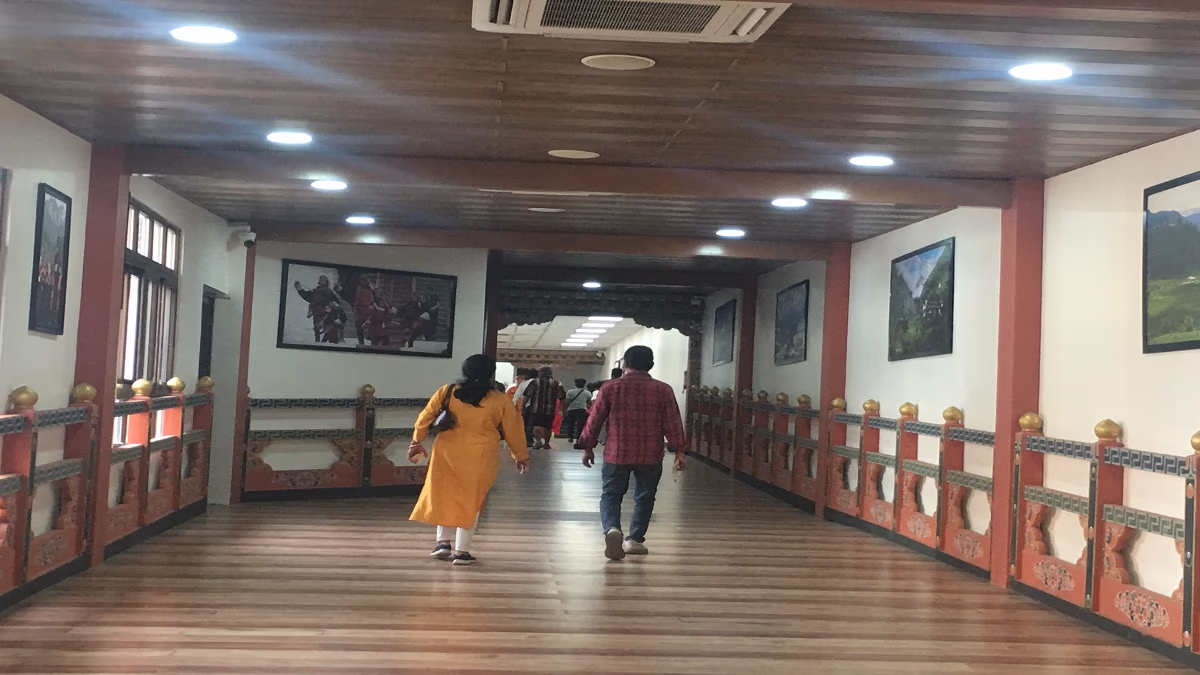 The wide hallway showcased Bhutanese royal family portraits while air conditioning offered climate respite with comfy seating.