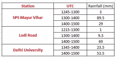 In Mayur Vihar, 9 cm of rain was recorded from 6.30 to 7.30 PM (just in one hour). Around 7 cm of rain was recorded on Lodi Road between 7.30 to 8.30 PM, while in Delhi University, more than 5 cm of rain was recorded between 7.30 to 8.30 PM.