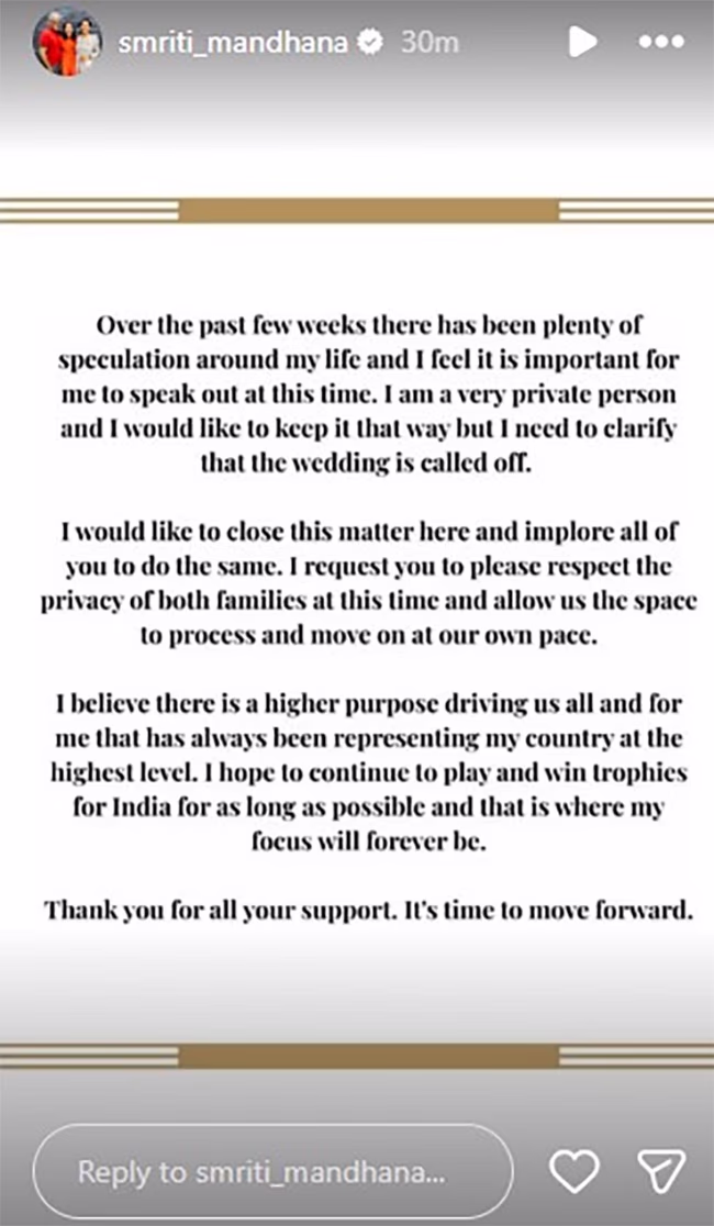 Smriti Mandhana also broke her silence on the split with singer Palash. In her Instagram post, she stated, "There have been many speculations about my life over the past few weeks, and I feel it's important to speak up now. I'm a private person and wish to remain so, but I must clarify that the wedding is canceled. I want to end this matter here and urge everyone to do the same. I request you to respect the privacy of both families during this time and allow us to come to terms with and move forward."