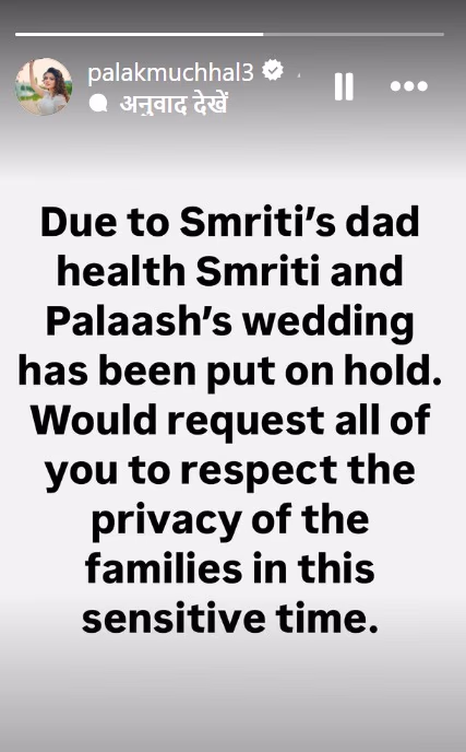 Palash Muchhal's sister Palak expressed, 'Due to Smriti's father's health, the wedding of Palash and Smriti has been halted. We kindly request that everyone respects the privacy of the families during this critical time.'
