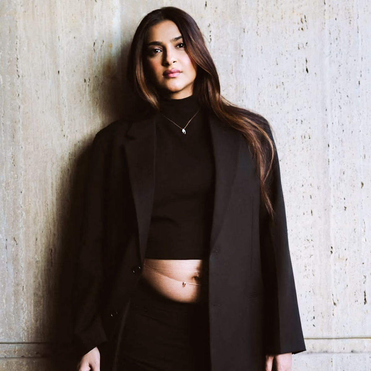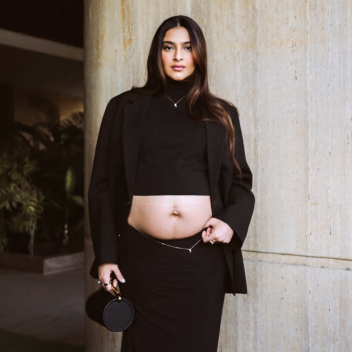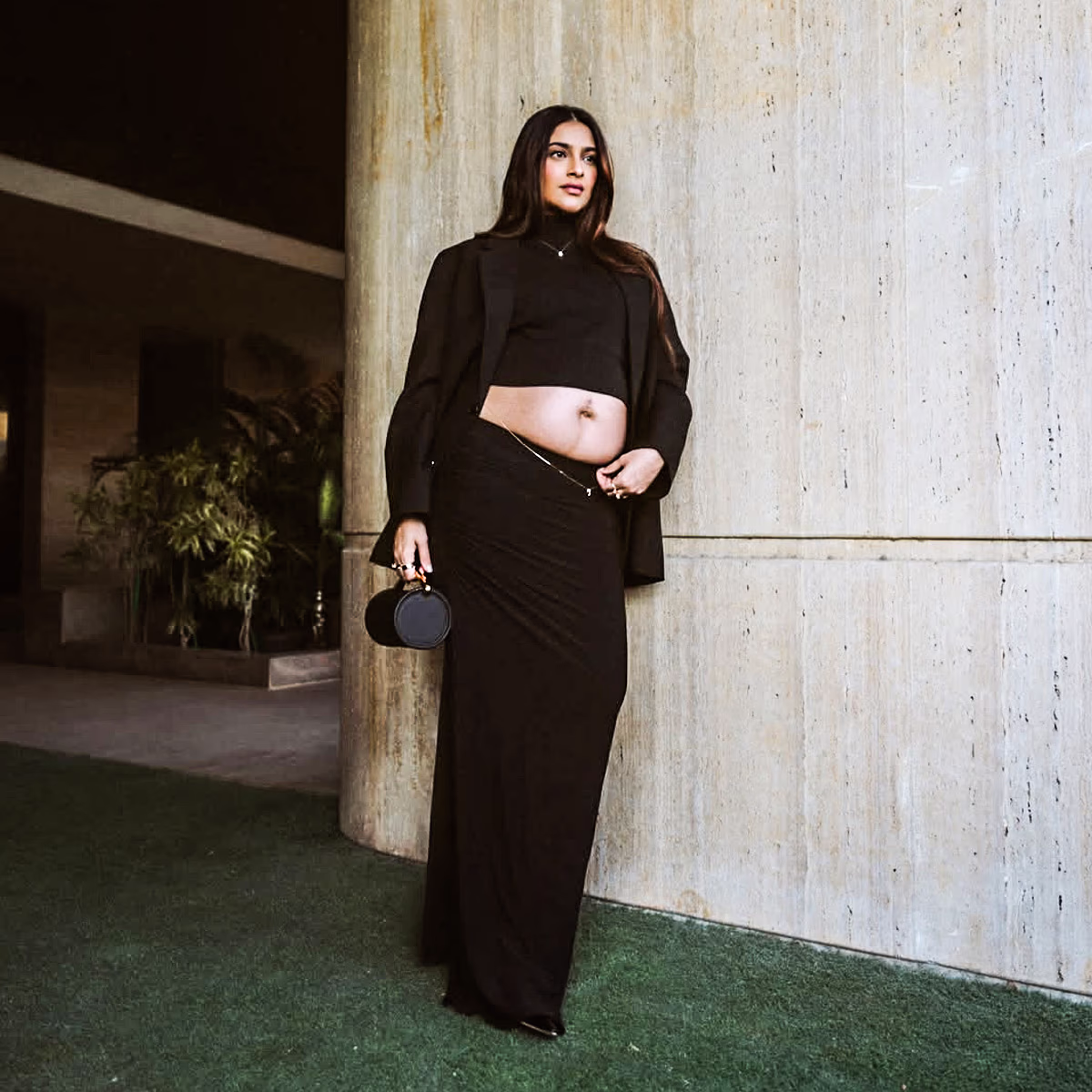 Sonam's maternity photoshoot showcases her in an all-black ensemble where she looks every bit the diva. She has paired a black crop top and long skirt with a chic black blazer.
