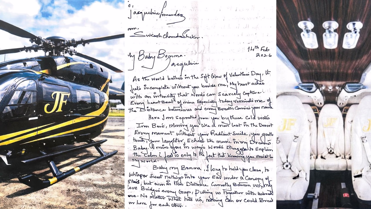 Imprisoned conman Sukesh Chandrasekhar has claimed this Valentine's Day to have gifted the actress Jacqueline Fernandez a luxury helicopter from Airbus. In an emotional letter, on this romantic occasion, he expressed his profound love, regrets, and dedication. The letter begins with 'My Baby Bomma Jacqueline,' addressed to 'To, Jacqueline Fernandez,' and signed off 'From, Sukesh Chandrasekhar.' He wrote about feeling separated by 'cold walls and iron bars,' missing her like 'a man lost in the desert.' Sukesh stated, 'Every beat of my heart reminds me of the distance between us. Yet, nothing can break our love.'