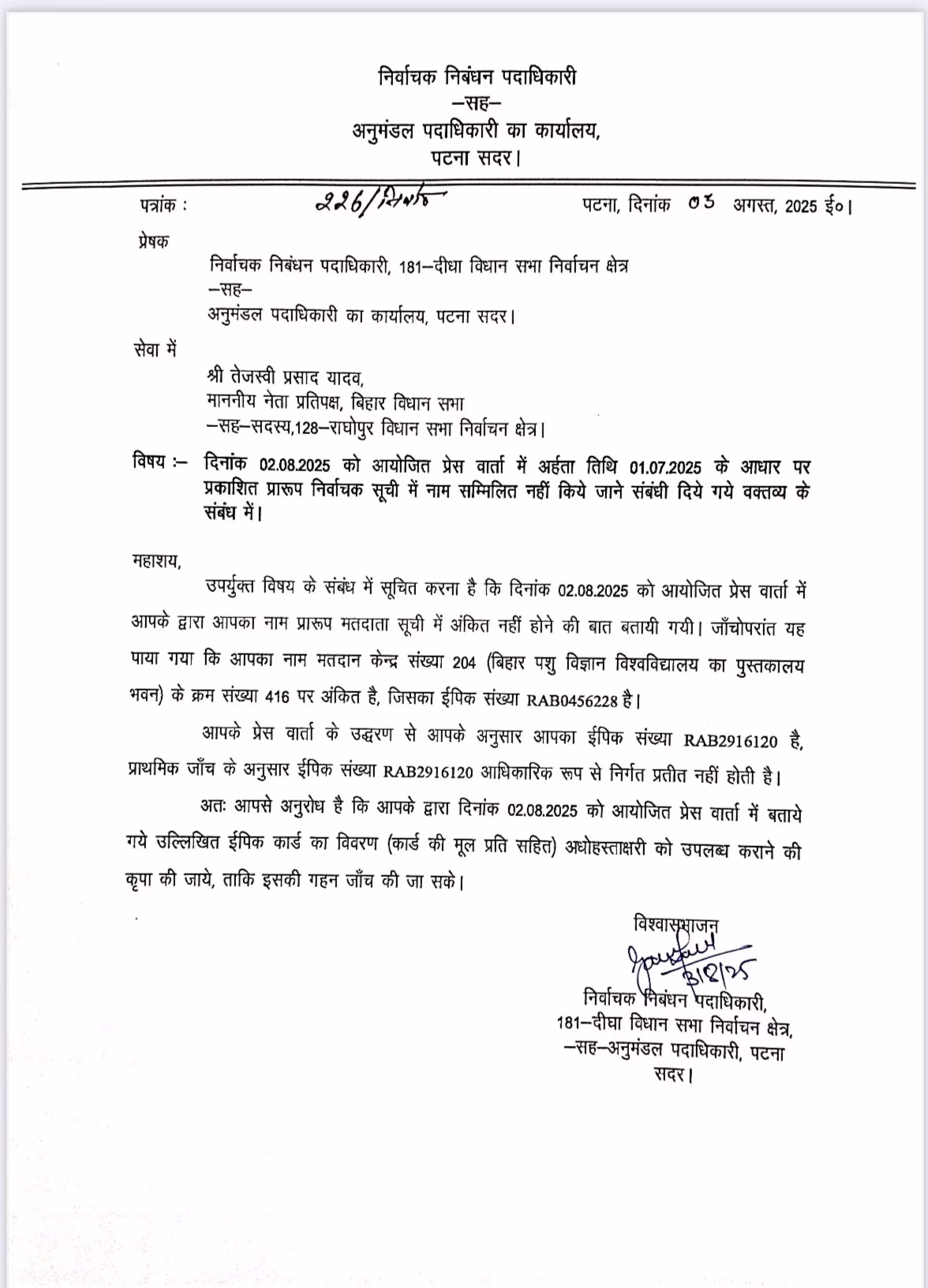 Tejashwi Yadav previously alleged that his name was removed from the voter list, but the commission labeled this claim as baseless, stating his name remains in the draft voter list. The Election Commission has directed Tejashwi Yadav to respond with factual information.