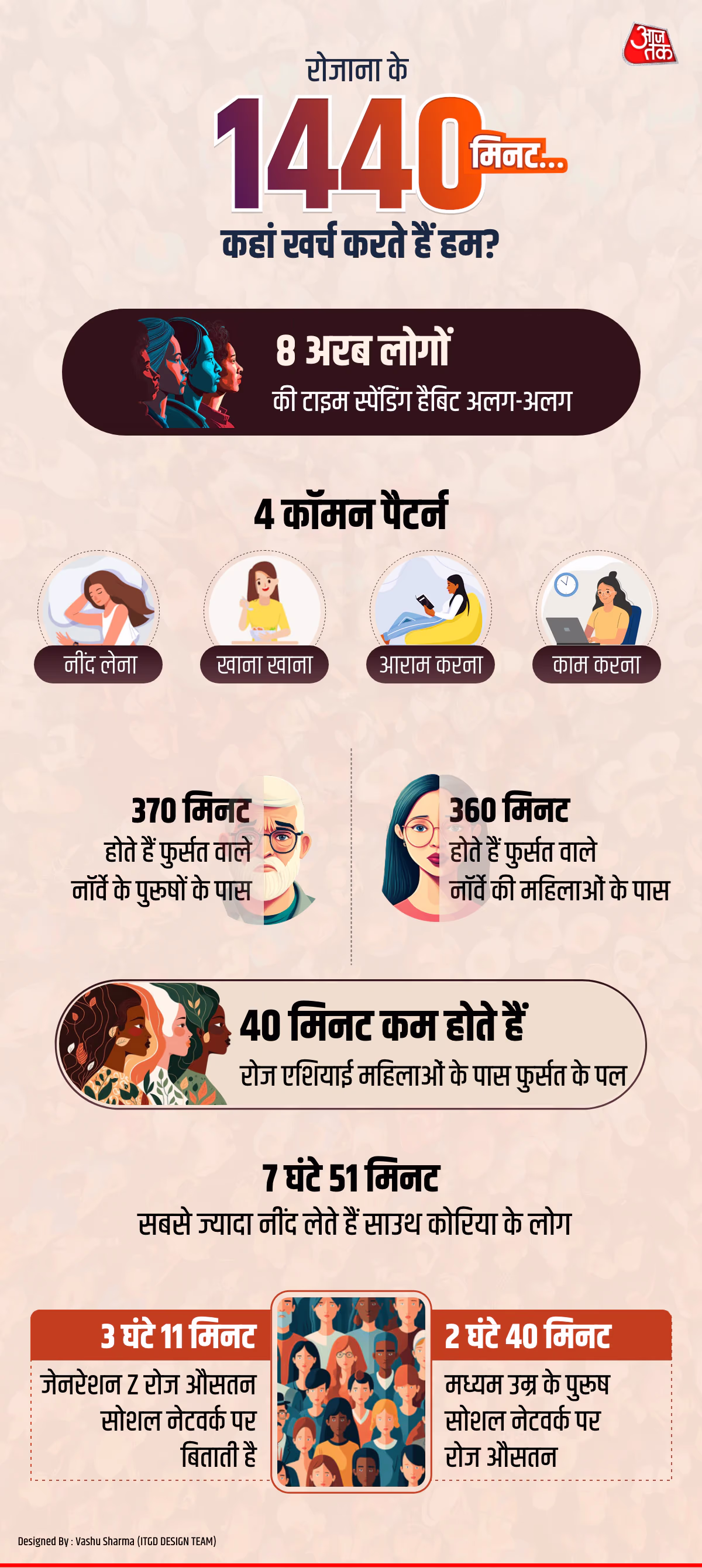 Every person on Earth has access to the same 24 hours, or 1,440 minutes, each day. Yet, how this time is used varies drastically due to diverse lifestyles influenced by jobs, geographic locations, and personal habits. In many modern jobs, people spend 14 to 15 hours in the office. Historically, until the 19th century, there were no standardized working hours.
