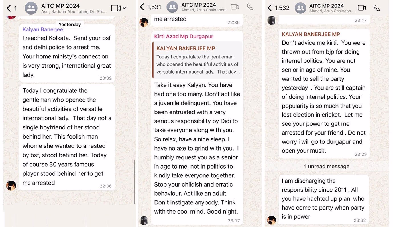 Amit Malviya shared WhatsApp chats, purportedly containing exchanges between Kalyan Banerjee and Kirti Azad. The chat begins with a message from Banerjee, stating, 'I've reached Kolkata. You can send your BSF and Delhi Police to arrest me. Your connections with the Home Ministry and the International Great Lady run deep. Congratulations to the gentleman who exposed her luxurious activities.'