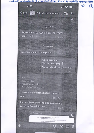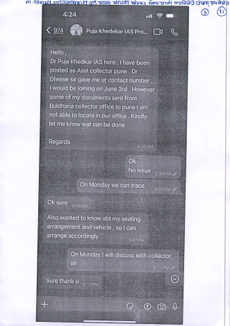 The chats uncovered that she told the officer to please complete the cabin or car business before her joining on June 3rd. She would not have time later. If this is not possible, let her know, and she would talk to the Collector Sir about it. The District Collector raised these unusual demands before the Chief Secretary, suggesting in his report that continuing Pooja Khedkar's training in Pune would be inappropriate and could lead to administrative complications.