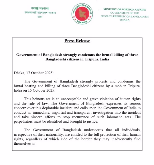 Foreign Affairs Ministry spokesperson, Randhir Jaiswal, stated that on October 15, an incident occurred in Tripura that resulted in the deaths of three Bangladeshi smugglers. These individuals were reportedly attempting to rustle cattle after illegally crossing the international border. They allegedly attacked local villagers with iron rods and knives, resulting in the death of one individual. The villagers retaliated against the attackers.
