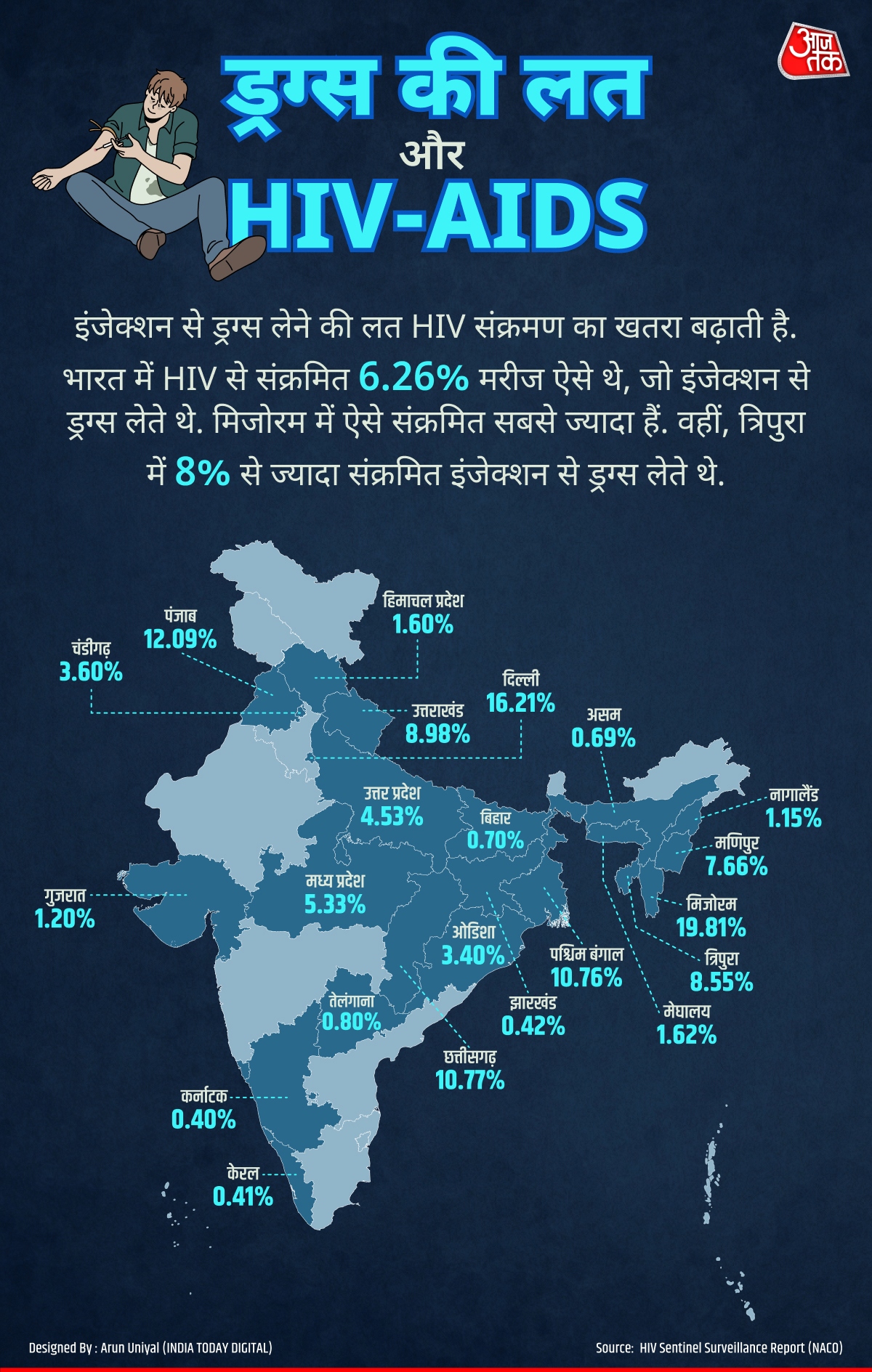 In Mizoram, approximately 20% of HIV cases were attributed to injection drug users, with Delhi following at over 16%.