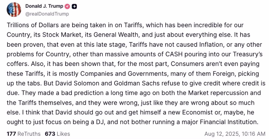 Trump further stated that even in the final phase of tariffs, it has proven that inflation or other issues haven't surfaced in America. On the contrary, a substantial amount of cash has flowed into the treasury. However, David Solomon and Goldman Sachs refrain from crediting this, as their predictions regarding market outcomes and tariffs have been proven wrong.