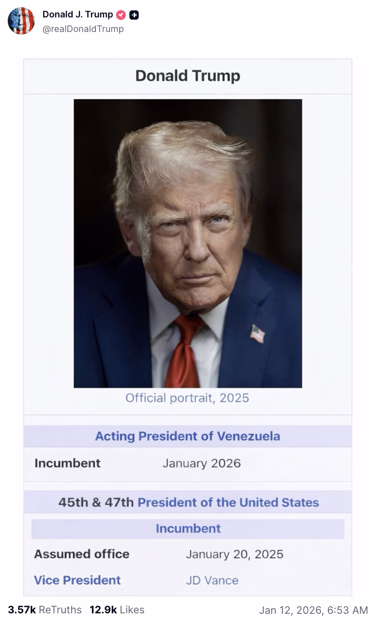 American President Donald Trump has set off an international storm with a post on his social media platform, Truth Social. In this post, featuring his official portrait, Trump declares himself as the ‘Acting President’ of Venezuela. At the same time, he presents himself as the 45th and 47th President of the United States, having assumed office on January 20, 2025.