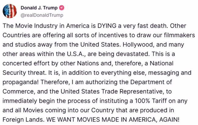 On a typical Monday morning, President Donald Trump's proclamation sent shockwaves across the global film industry. Using his social media platform, Trump announced an imposition of a 100% tariff on films produced on foreign soil being introduced in the United States.