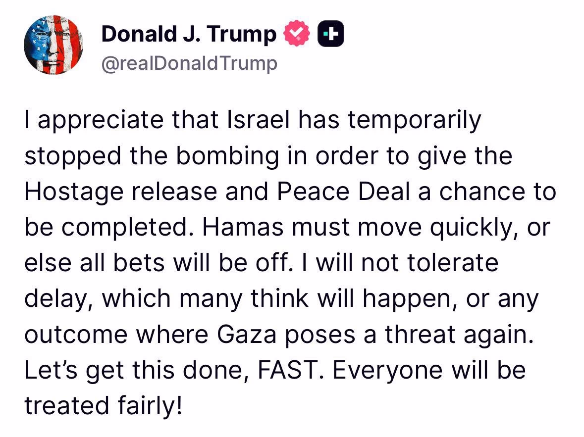 In his Truth Social post, Trump expressed appreciation for Israel's temporary pause in bombings to secure hostage freedom and progress peace accords. Hamas must now act swiftly, or all bets are off. He refuses to accept any procrastination or outcomes that resurrect threats from Gaza. Expedite the process for justice and fairness to prevail.